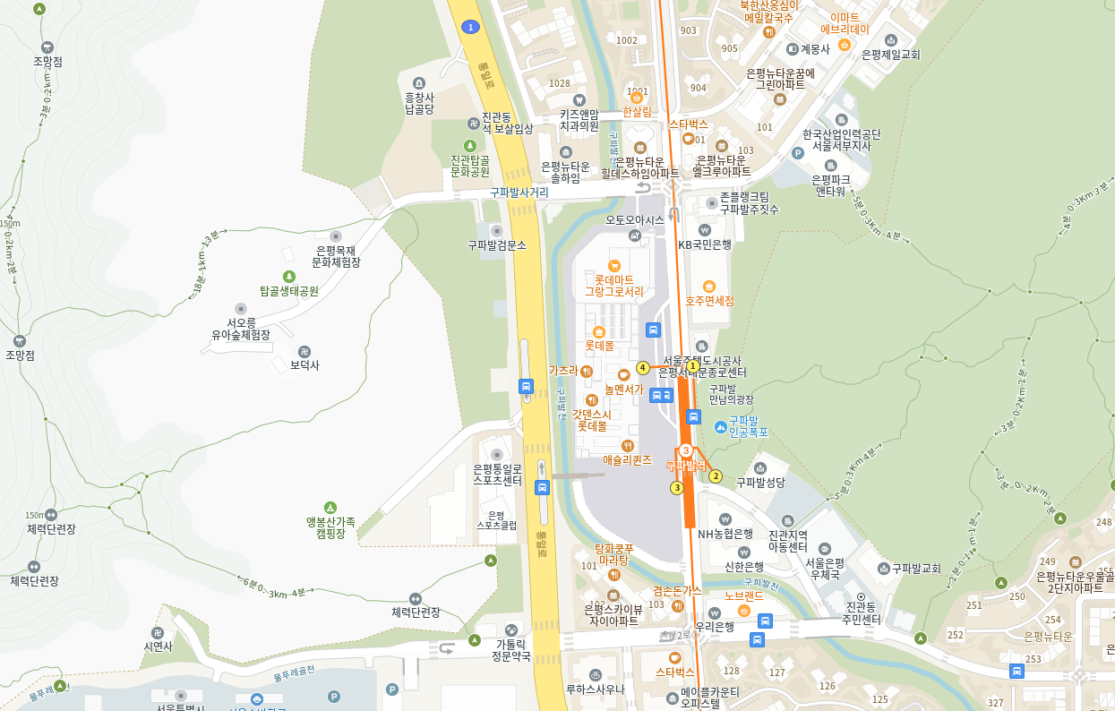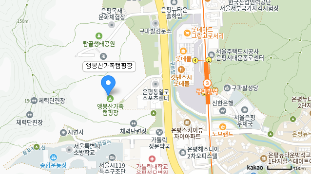 이 캠핑장은 은평뉴타운 바로 옆, 즉 구파발에 있습니다. 그냥 도로 따라 쭉 내려가면 바로 1번 국도, 즉 통일로가 나옵니다. 그리고 그 건너편에는 이 동네 최대 규모의 쇼핑몰인 롯데몰 은평점이 있습니다. 그리고 그 옆에는 바로 구파발역입니다. 언덕을 꽤 올라가야 하는 만큼 다리는 살짝 피곤하겠지만 버스나 지하철만으로도 캠핑을 올 수 있는 그런 입지입니다. 그리고 서울 어디, 즉 아예 정 반대인 강동에서 오더라도 1시간 정도면 오고 갈 수 있는 위치입니다. 어린이 동반 캠핑에서 이 거리는 상당한 메리트가 됩니다.