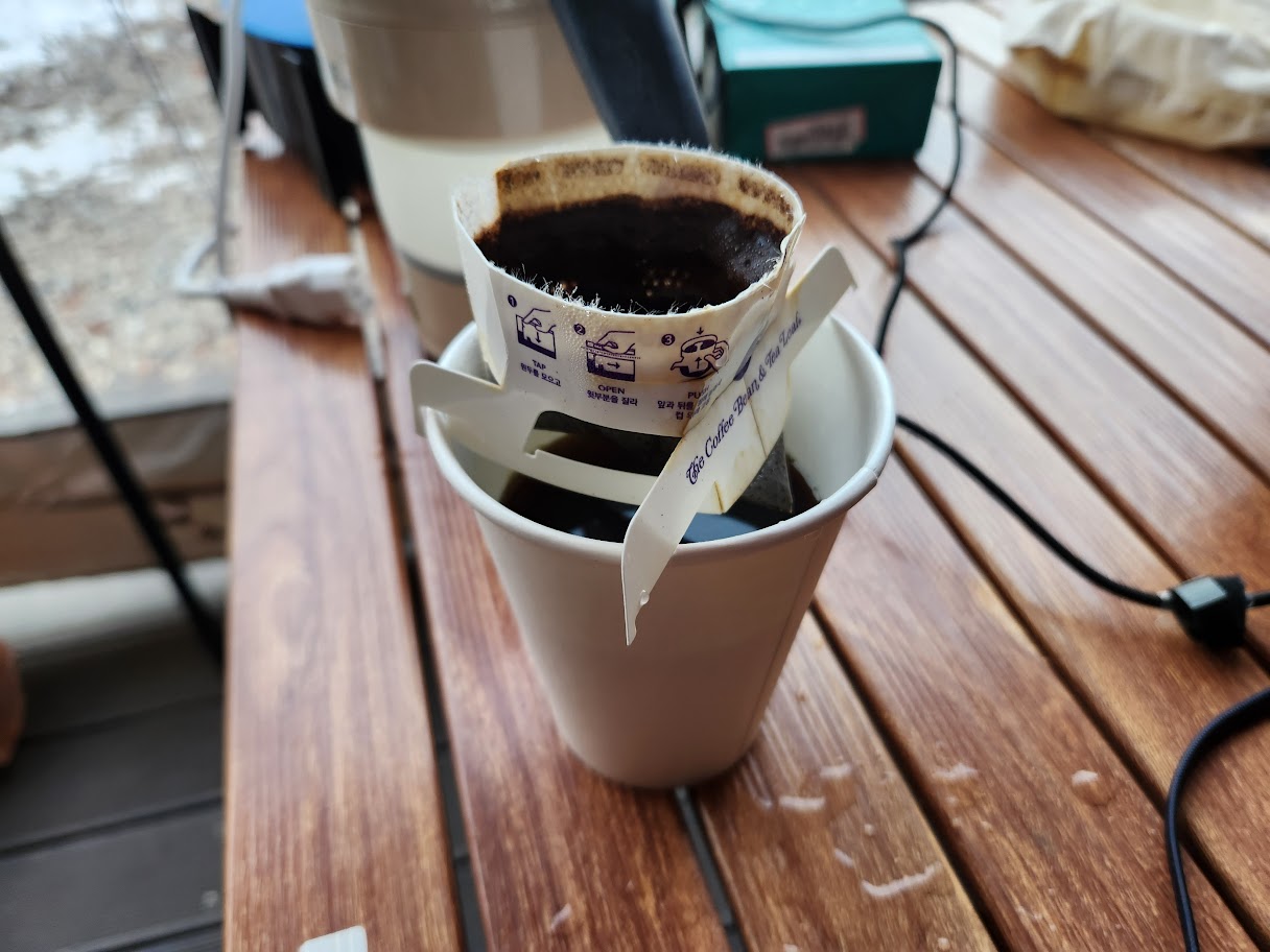 이렇게 장비를 차에 구겨 넣어야 하기에 부피가 큰 불필요한 것은 최대한 줄였고, 이번에는 캡슐커피 머신을 뺐기에 포트에 물을 끓여 드립 커피를 내렸습니다. 에스프레소와 달리 드립은 드립 나름의 맛과 향이 있습니다. 부드러운 맛 말이죠.^^