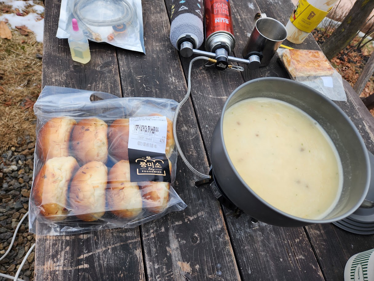 먼저 조리가 쉬운 볶음밥을 후딱 볶아 먼저 해치우고, 전날 사준 대파 모닝빵에 스프를 끓여 찍어 먹습니다. 처음에는 찍어 먹다 나중에는 그냥 푹 담가 불려 먹는데, 차가워서 대파의 맛이 잘 살지 않는 것이 아깝지만, 배는 따뜻하고 설겆이도 편합니다.