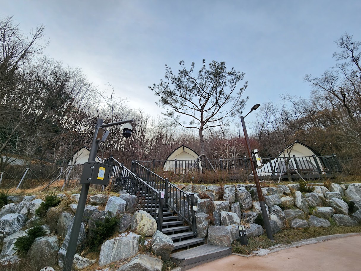 위에 적은 바와 같이 죽어라 언덕을 오르면 가장 위에 글램핑용 텐트 3동이 있습니다. 이건 동계, 그 가운데서도 가장 추운 1월과 2월에는 운영을 안 합니다. 글램핑이라 정말 있는 것은 다 있는 그런 동네입니다.