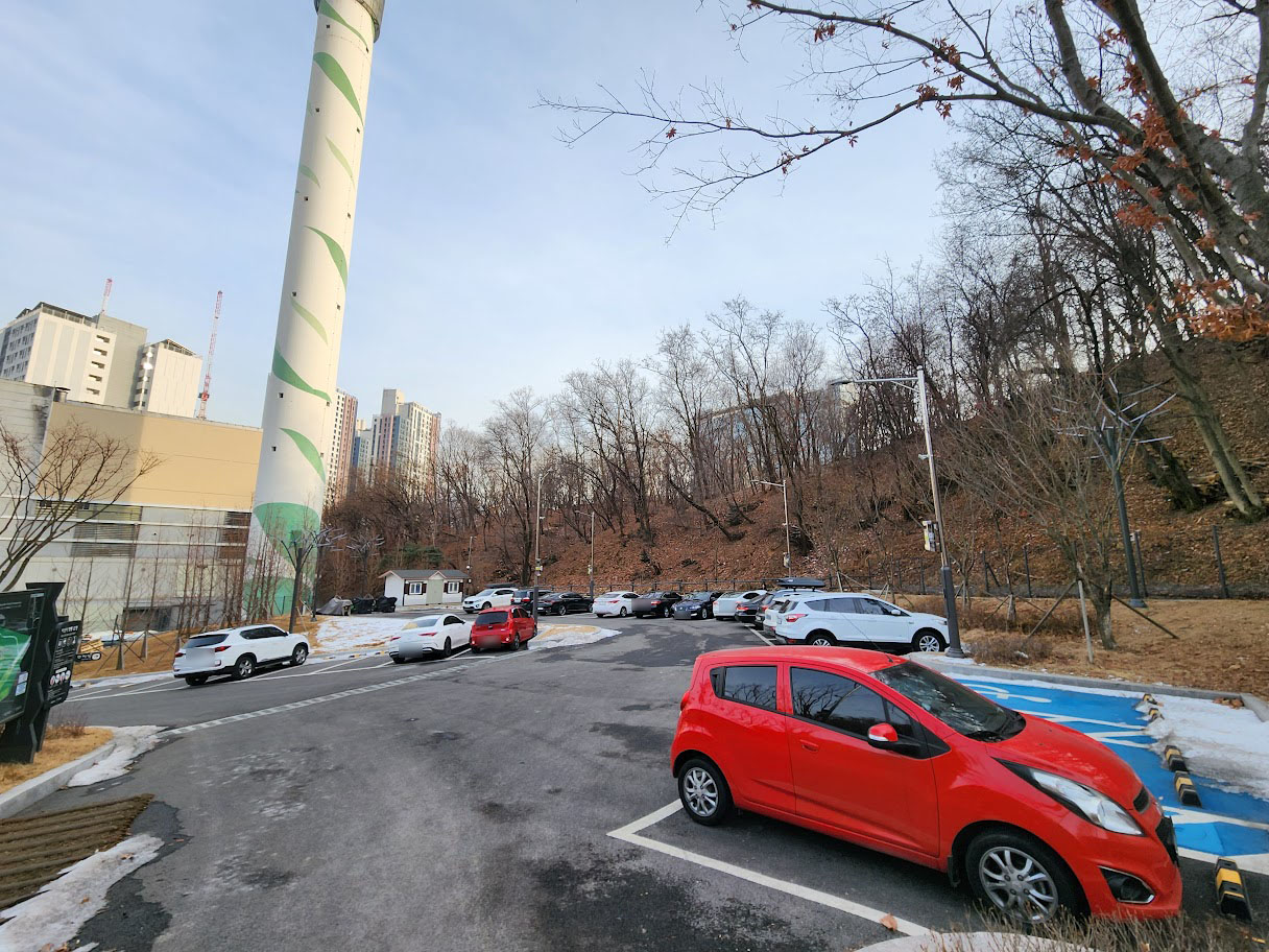 그러면 나머지 시설을 후딱 보고 텐트를 쳐야죠. 열심히 액셀 페달을 밟아 산을 오르면 이런 주차장이 나옵니다. 주차 공간은 딱 영지 당 한 대 정도로 여유롭지는 않으며, 만약 한 영지에 여러 사람이 놀러온 경우라면 구파발역 주차장에 차를 댄 뒤 좀 걸어 오시거나 하는 것이 좋습니다.