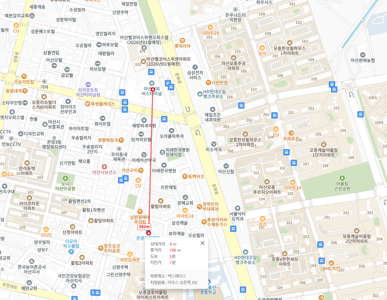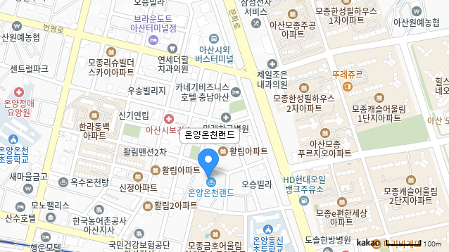 일단 먼저 지도부터 꺼내 듭니다. 온양온천랜드는 '온양온천답지 않은' 손님층을 자랑하지만 위치부터 이미 범상치 않습니다. 지금까지 소개한 온양온천 목욕탕들, 사실 온양온천에 속하는 거의 대부분의 목욕탕은 온양온천역에서 도보로 갈 수 있는 주변에 몰려 있지만, 여기는 오히려 아산버스터미널에 가깝습니다. 물론 온양온천역에서 엄청나게 먼 것은 아니고 버스로 5정거장 정도입니다만 그래도 두 블럭 차이는 나기에 좀 이질적이기는 합니다. 다른 온천은 시외버스로 올 때는 시내버스를 한 번 갈아 타야 하지만, 반대로 이 온천은 지하철이나 무궁화호를 타고 오면 버스로 갈아타야 합니다.