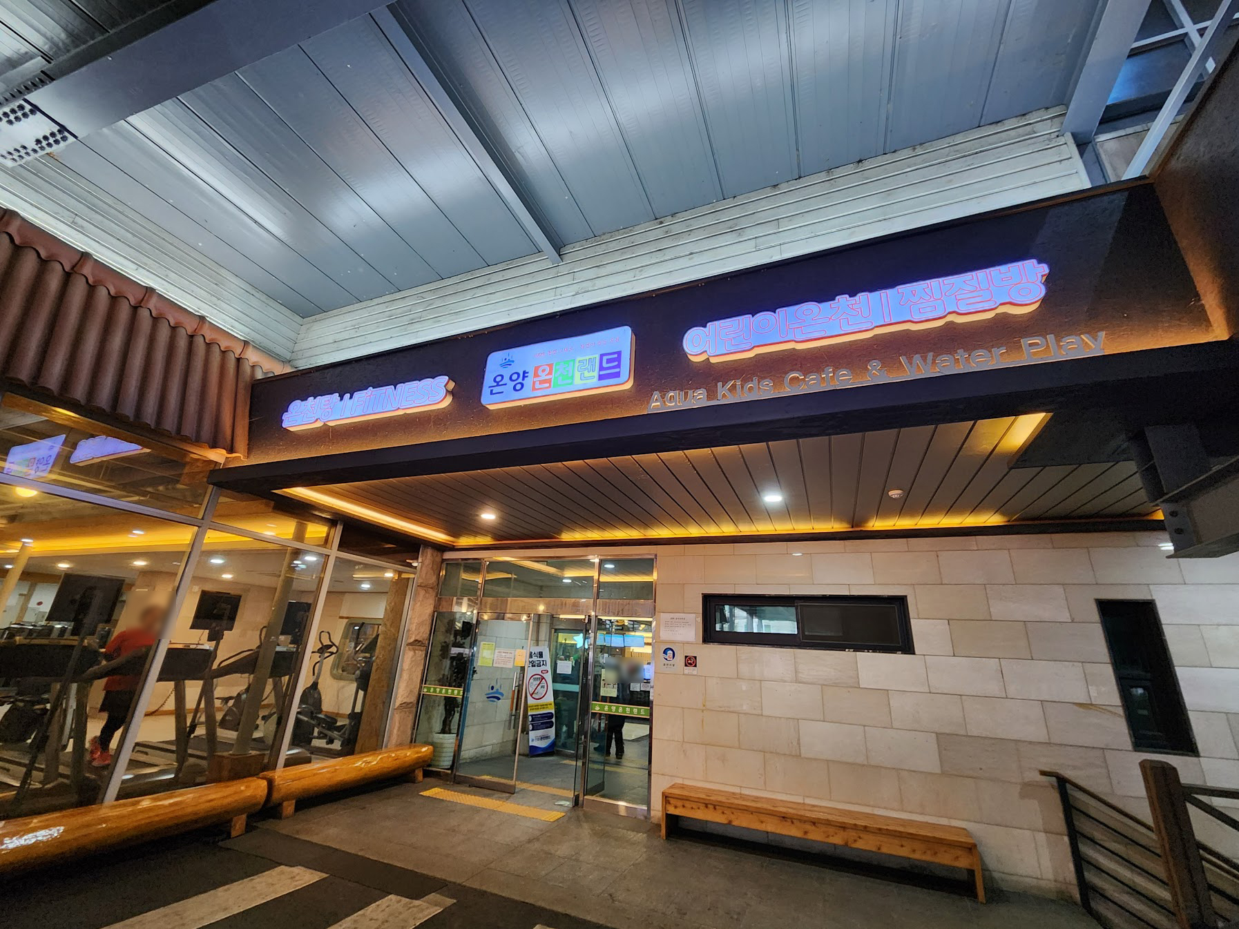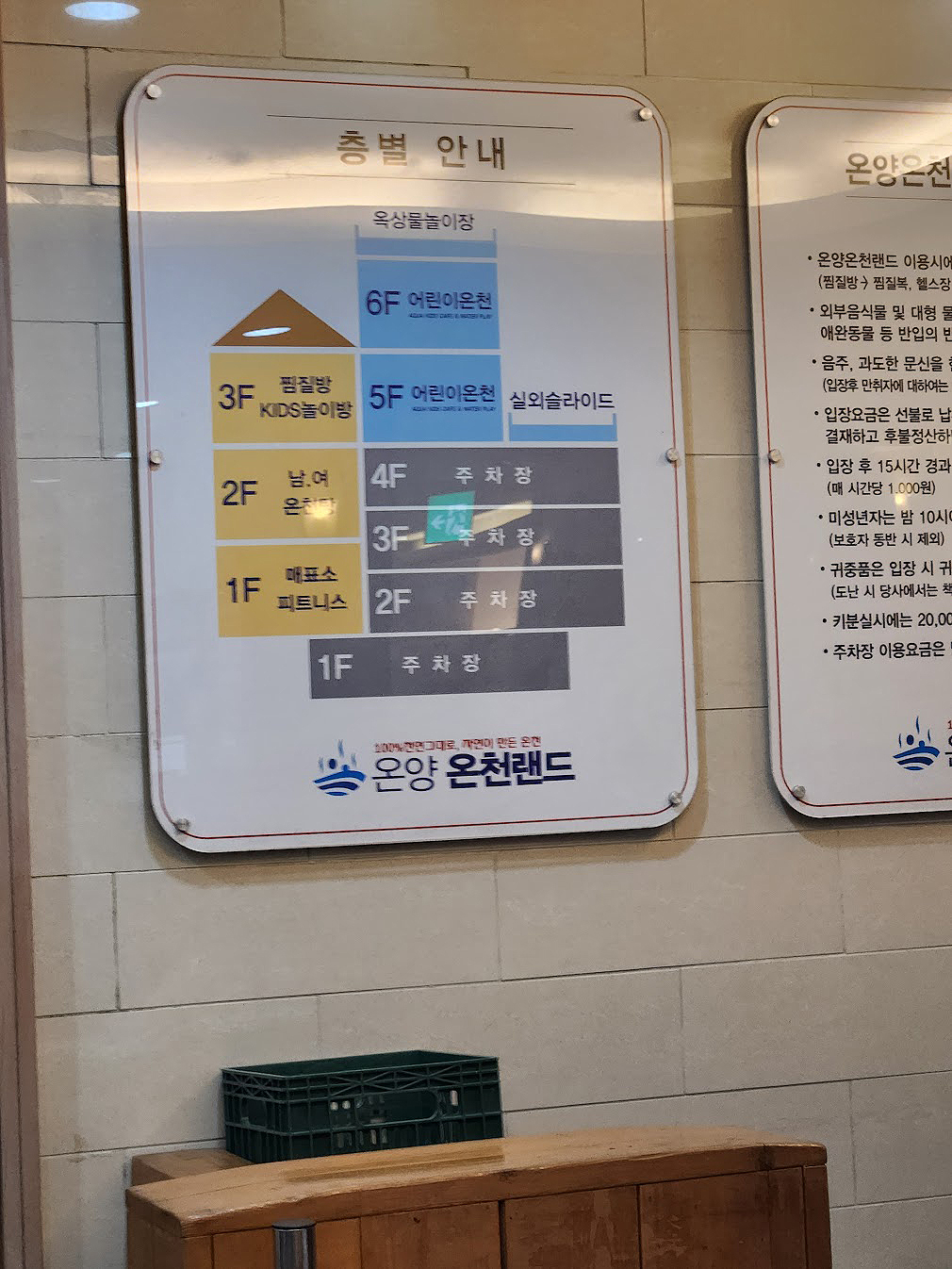 온양온천의 다른 목욕탕들과 비교해 온양온천랜드는 근본적으로 다른 부분이 있습니다. 다른 곳들은 말 그대로 '목욕'을 위한 곳이지만 여기는 그 목적만이 아니기 때문입니다. 일단 건물 입구에 붙은 이 표지판을 잘 보십시오. 특히 오른쪽 말입니다. '어린이온천'이라고 적혀 있을텐데 이것이 온양온천랜드의 정체성입니다. 어린이온천?! 이렇게 써 놓으니 어려운데... 쉽게 말하면 그냥 스파입니다. 예. 온양온천랜드의 핵심은 이 스파인 것입니다. 이전에 신북온천 이야기를 적었지만 이런 스파들은 어린이 비중이 압도적으로 올라갑니다. 정말 기회가 되면 적을 파라다이스스파 도고도 그렇구요.