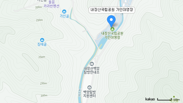 가인야영장은 백양사의 바로 앞에 있는데, 실제로 위 안내도의 윗쪽 노란 길이 백양사 경내로 들어가는 길입니다. 시설은 위 약도대로 입구쪽에 카라반이 있고 그 옆에 주차장, 그리고 오른쪽으로 캠핑장 영지가 배치되어 있습니다.