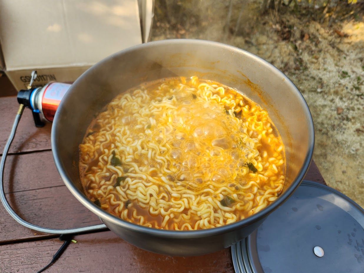 일단 늦은 점심부터 해결해야 했는데, 귀찮을 때는 라면만한 것이 없습니다. 서울 출발 전 산 싸구려 라면(4봉지에 2,000원)을 후루룩 마시고 남은 국물에 오뎅 꼬치를 끓입니다. 나름 매운 오뎅이 재현되는데, 정말 없어 보이기는 하지만 사실 이렇게 먹어도 어묵은 어묵이라 맛은 좋습니다.