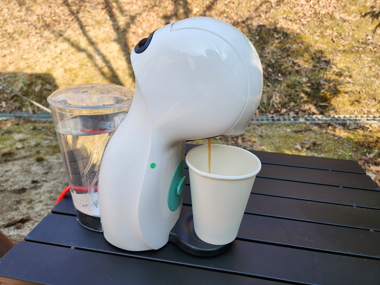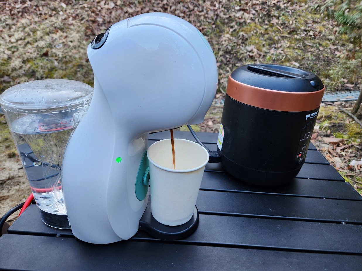 밥도 먹었으니 후식도 해야겠죠. 이번에도 캡슐 커피 머신은 제 역할을 다 합니다. 아직은 공기가 따뜻해도 따뜻한 커피가 싫어지는 계절은 아니라서 따뜻하게 우린 아메리카노 한 잔을 준비하고 오징어 한 봉지를 꺼내 테이블에 놓은 뒤 영화 재생 모드로 들어갑니다. 그렇지만 해가 슬슬 아래로 내려오면서 기온이 나름 빠르게 내려가기에 6시 이전에 텐트 속으로 들어와 누워서 영화 감상 모드로 바꿉니다. 늦은 낮잠도 겸해서...