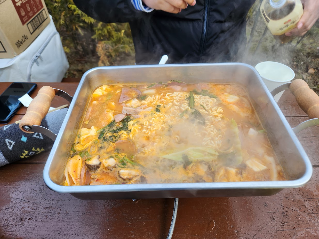 이번에는 출발 전부터 불판이나 숯불 모드가 아닌 냄비 모드로 가기로 했기에 저녁은 만두 전골을 하기로 했습니다. 만두 전골은 밀키트가 그런대로 잘 나오는 편이고, 부족한 야채는 가볍게 사서 보충하면 되기에 퀄리티를 높이는 것이 어렵지도 않죠. 기본 밀키트에 여러 버섯과 쑥갓을 더해 보글보글 끓여 먹으니 그런대로 맛도 있고 정리도 깔끔합니다. 정리도 끝내고 하늘의 별 구정도 잠시 한 뒤 이불 속으로 쏘옥~