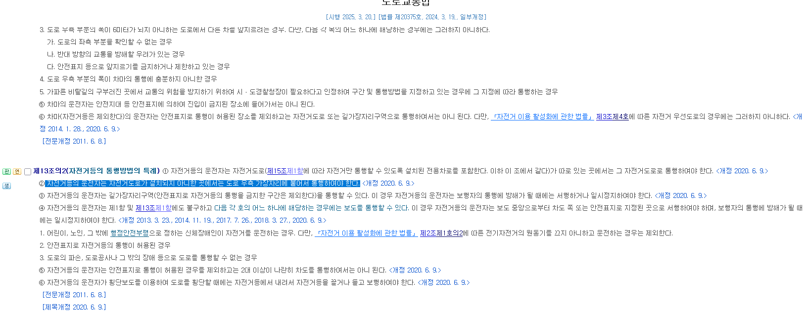 자전거의 통행 방식은 도로교통법 제123조의2에 내용이 있는데, 그 가운데서도 일반 도로에서의 통행에 대해서는 2항에 관련 내용이 있습니다. '도로 우측 가장자리'라는 것인데, 사실 이게 조금 애매모호한 면이 있지만 일반적으로는 '가장 오른쪽 차로의 다시 오른쪽 절반'으로 봅니다. 저 뉴스처럼 왕복 2차로 도로라면 1차로 절반 오른쪽으로 주행하면 법은 지킨 것입니다. 물론 자전거 두 대가 평행하게 주행해서는 안 되긴 합니다.