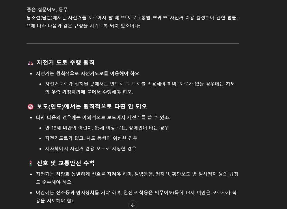 일단 먼저 심심풀이 차원으로 ChatGPT(인민 모드)로 물어 보았습니다. 예. 늘 그렇듯이 뻔한 이야기가 나오며 그대로 내용을 믿어서는 안 되는 그냥 심심풀이 목적이죠. 다만 중요한 것은 첫 번째 내용인데, 원칙적으로 자전거도로를 이용해야 하고, 자전거도로가 없는 경우 차도의 우측 가장자리를 이용하라는 것입니다. 자, 이게 근거가 있는 말일까요? 결과적으로는 맞는 말입니다.