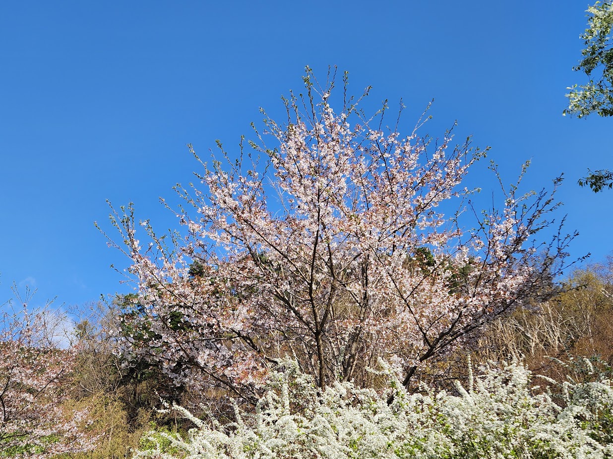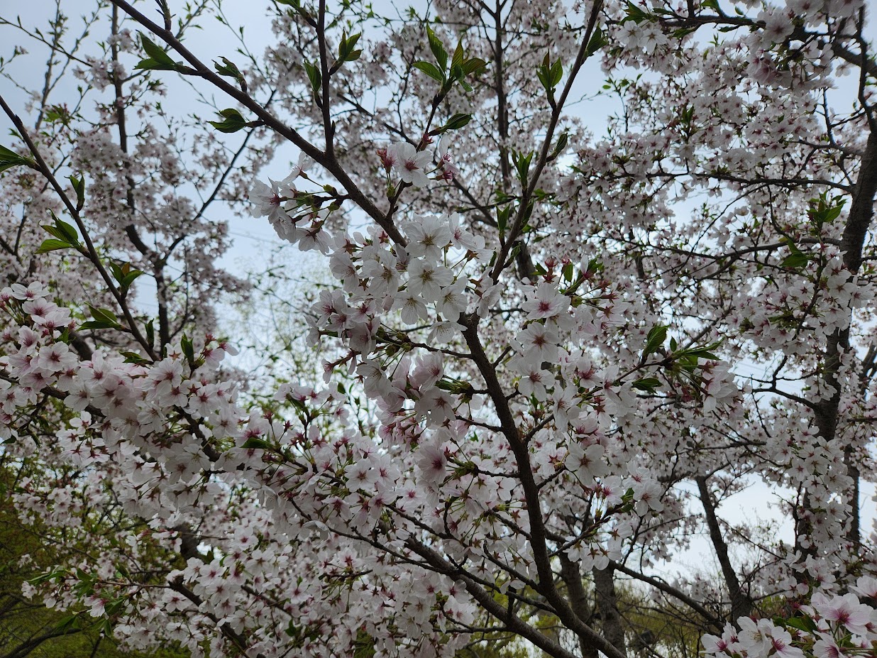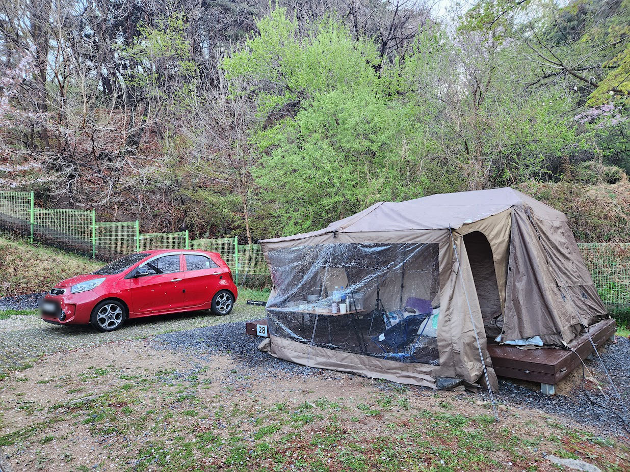 하늘이 조금 회색으로 바뀌기는 했지만 아직 비는 내리기 전인 캠핑장의 풍경. 벚꽃이 절정인 아름다운 모습입니다. 정말 벚나무 아래의 캠핑 그 자체입니다. 캠핑장은 정말 작지만 벚꽃으로 둘러싸인 이 때만큼은 정말 여기만큼 아름다운 곳도 없습니다. 닭살 돋는 뻔한 멘트입니다만, 그만큼 풍경만은 좋았습니다. 텐트를 거의 다 치기 전까지는 말이죠.