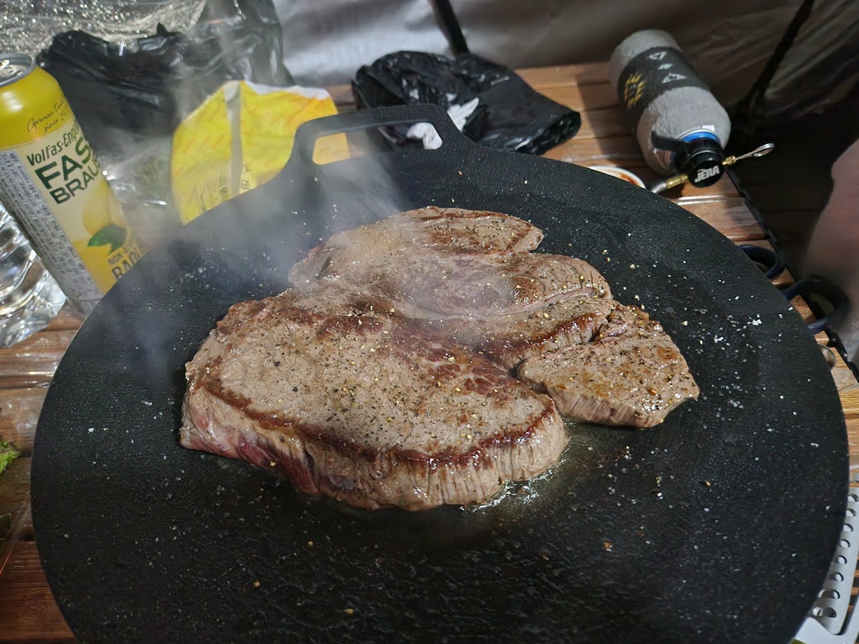 스테이크 고기는 웰던으로 잘 굽고, 대구식 육개장으로 쓰고 발전형 쇠고기 무국으로 읽는 것을 끓입니다. 아, 밥솥에 밥은 미리 해 놓았죠. 고기는 한 근이 안 되니 두 명이 밥 반찬으로 충분하고 육개장을 떠 밥에 살짝 부어 비벼 먹습니다. 퀄리티가 좀 떨어지는 밀키트이긴 해도 빨간 쇠고기 무국으로 생각하면 나름 깔끔하게 먹을만한 수준입니다. 다만 저녁이 되면서 비가 예상보다 강해져 시간당 3~5mm 이상으로 세지고 바람도 강풍 주의보가 뜰 정도로 좀 세져서 빗물이 고이지 않도록 텐트에 좀 조치를 취하고 잠을 청했습니다. 텐트 위로 떨어지는 빗소리는 자장가만큼 잠을 잘 부릅니다.