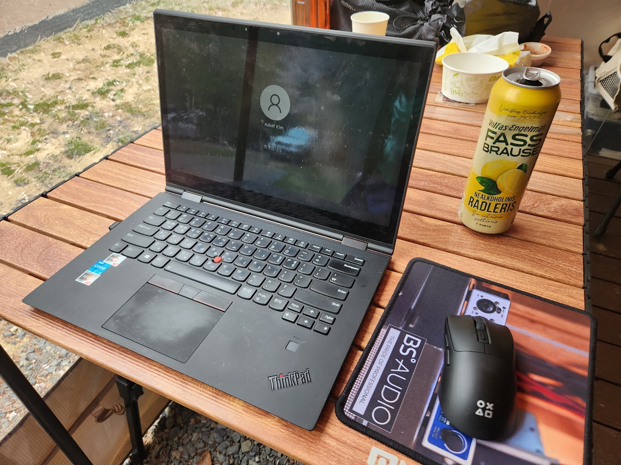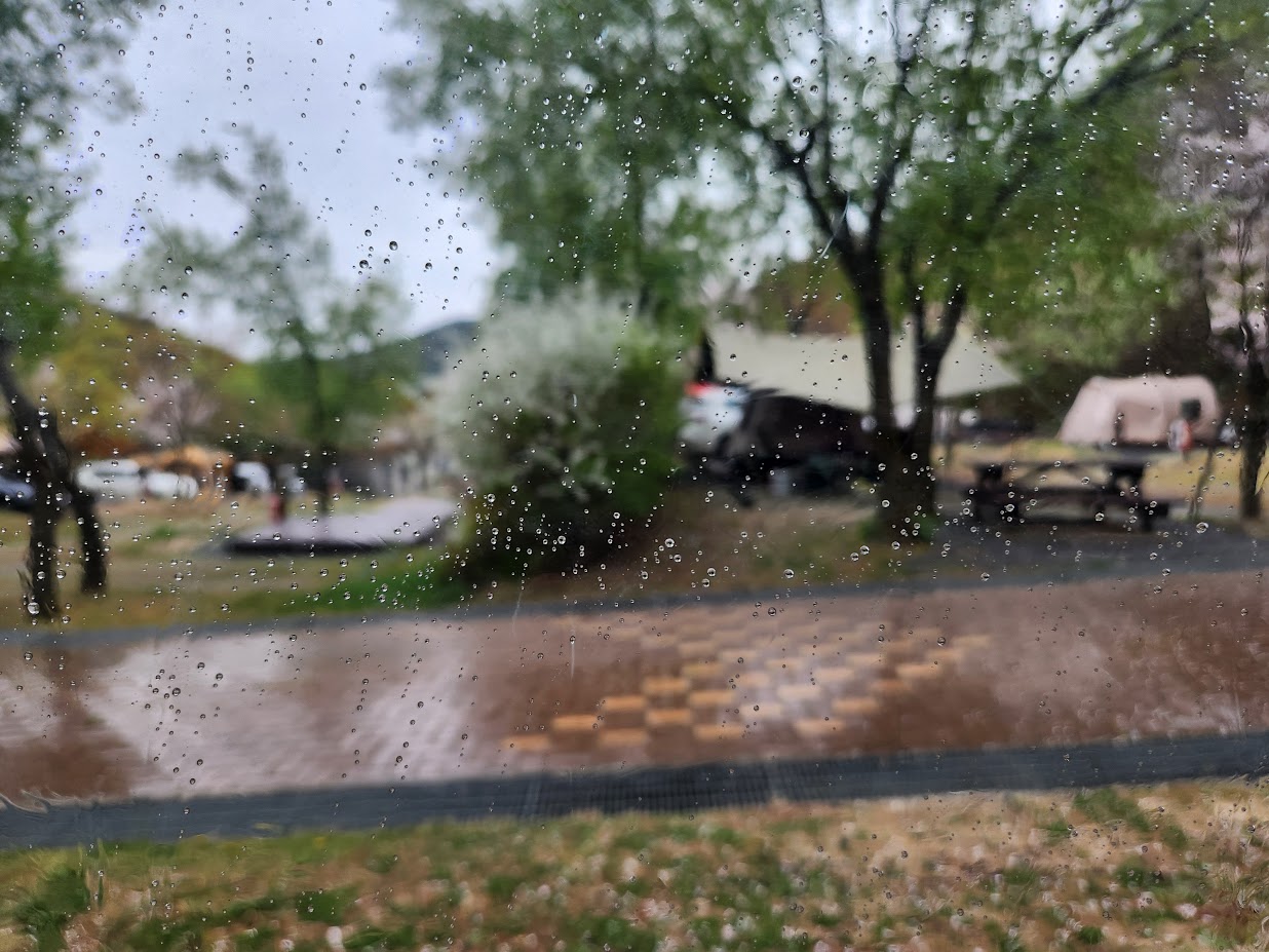 비는 조금 더 강해지고 PC를 설치하고 보는 영화 화면을 즐기며 가끔 고개를 돌려 PU 사이드월 너머로 물방울 너머 캠핑장을 봅니다. 내 머리는 젖지 않으면서 비 오는 풍경을 즐기는 것. 이것이 나름 우중캠핑의 멋이라면 멋이죠.