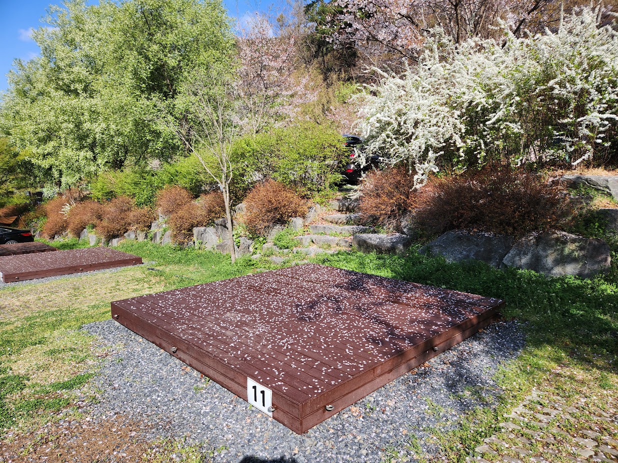 세찬 비바람에 만개한 벚꽃이 상당히 떨어져 어제와 다르게 꽤 볼품없는 모습이 되었습니다. 실제로 빈 영지에 떨어진 벚꽃잎을 보면 얼마나 많이 떨어졌는지 알 수 있죠. 차 위로도 벚꽃잎이 꽤 쌓였습니다. 산책을 겸해 캠핑장을 한 바퀴 도는데 마음이 조금 무거워집니다. 그 마음을 뒤로 하고 아침을 준비합니다.