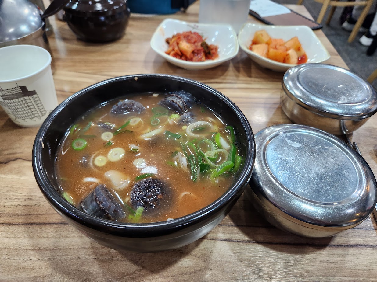 솔직히 이 집 썬데이 스프가 엄청나게 끝내주는 것은 아닙니다. 국물은 일반적인 돼지 기반이 아닌 소머리 기반인 어찌 보면 이단에 가깝죠. 순대도 고기순대가 아니라 그냥 막순대. 하지만 그 결과 국물이 깔끔한데다 대다수의 썬데이 스프집이 순대를 팔팔 끓이는데 비해 이 집은 그야말로 열만 가하는 정도의, 정말 썬데이 스프에서 순대가 차지하는 존재 이유를 제대로 살리고 있습니다. 원래 썬데이 스프에서 순대는 불리는게 아니라 내오기 전에 살짝 열만 가해서 오는게 FM이죠. 다대기를 적당히 넣어 얼큰 버전으로 만들어 먹고 일어섭니다. 가격이 역시 많이 오른게 슬프지만 여기는 일반으로 시켜도 순대는 그런대로 많은 편이라서 크게 불만은 없습니다.
