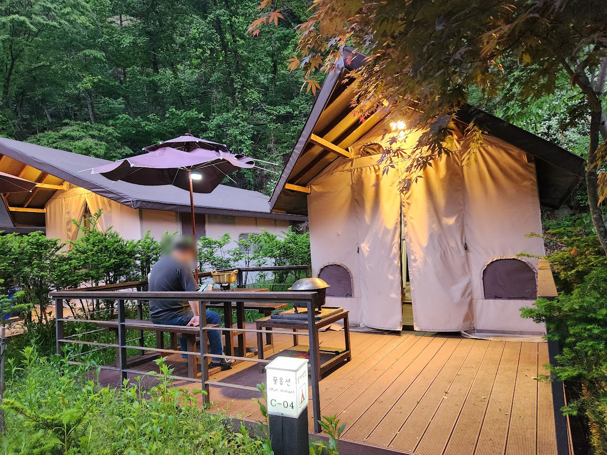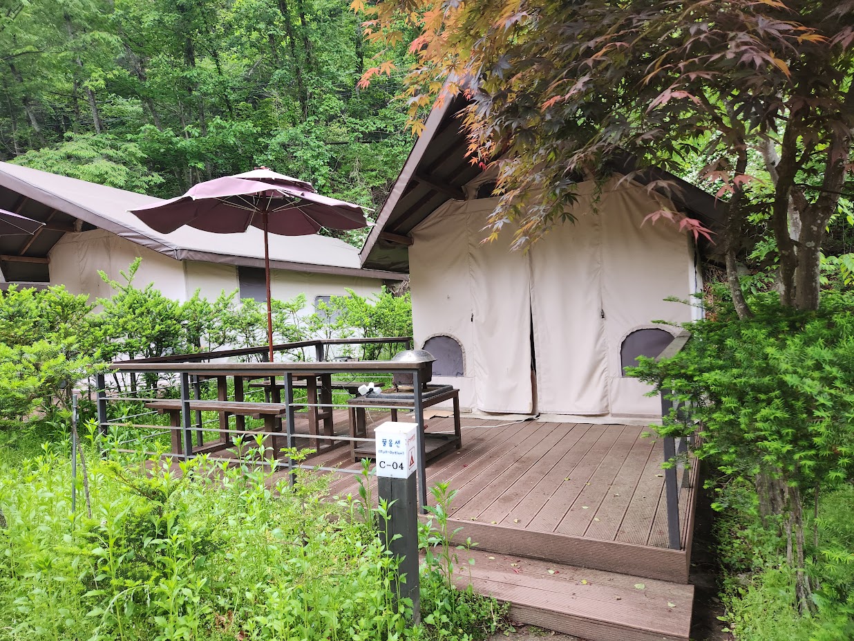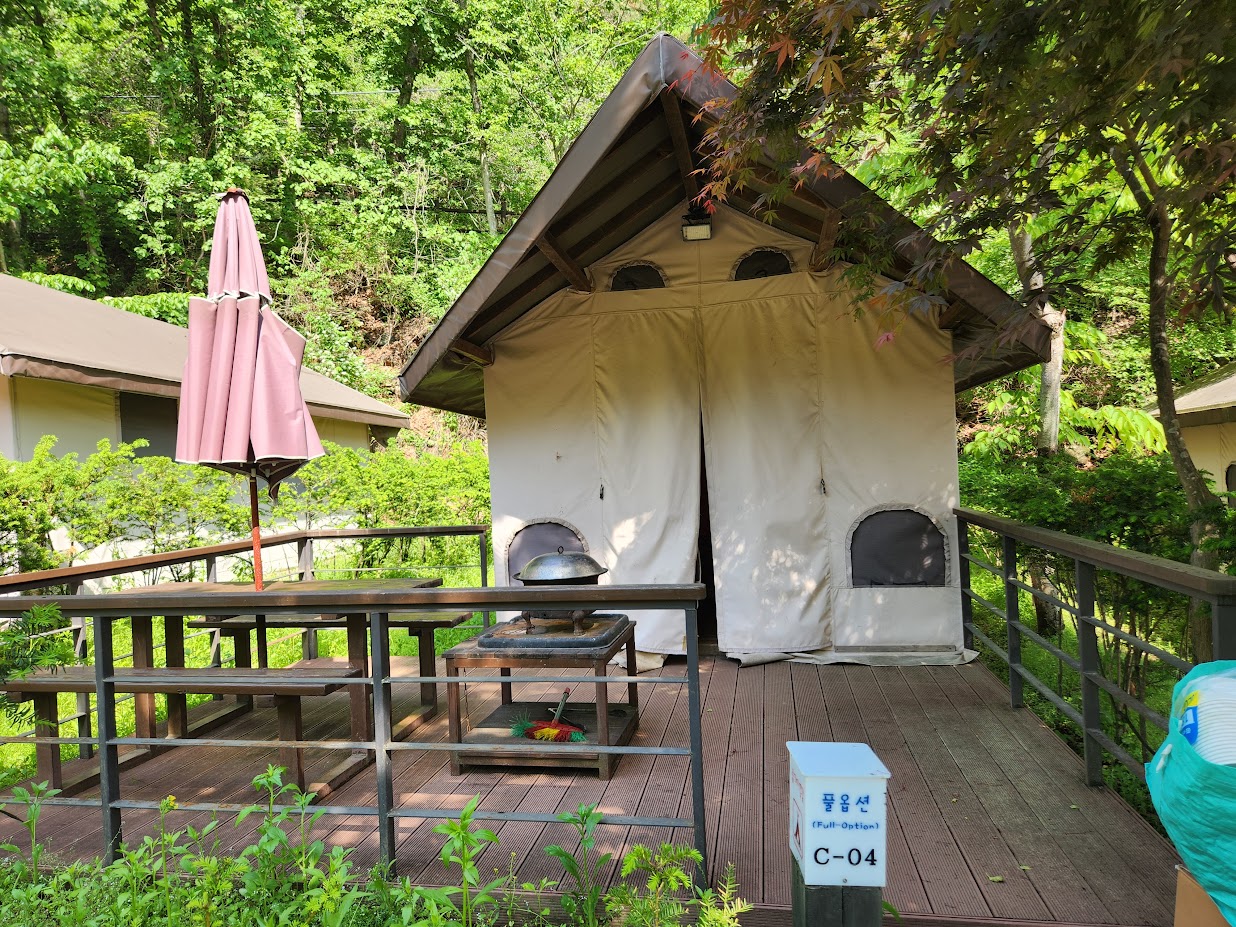 그렇지만 이 캠핑장의 꽃은 바로 산막텐트입니다. 가장 영지 수량도 많고 무엇보다 이 영지의 공식 명칭은 '풀옵션'입니다. 물론 이 말에 속으면 안 됩니다만, 이번에 잡은 것도 이 산막텐트입니다. 산막텐트라고 하지만 진짜 텐트는 아닌 가짜 텐트(?)에 가깝습니다. 반대편의 남천야영장의 산막텐트는 진짜 거실형 텐트지만 여기는 고정된 나무 프레임에 텐트 천을 씌워 놓은 준 하우스입니다.