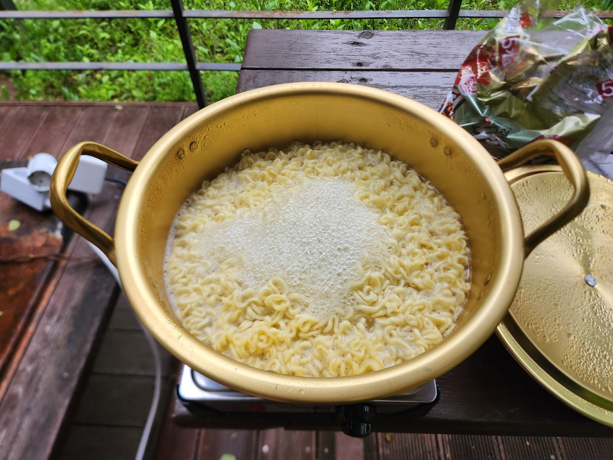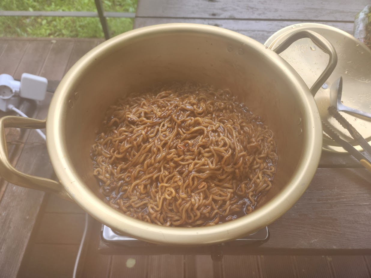개수대에서 따뜻한, 아니 뜨거운 물이 잘 나오는 덕분에 짜파게티는 빨리 익습니다. 열심히 익히고 스프 붓고 볶기까지 끝내고 후루룩 마십니다. 아직 본격적으로 해가 뜨기 전이라 부는 바람이 시원합니다. 이렇게 뒷정리도 마치고 잠시 여유를 즐긴 뒤 20분만에 철수를 마치고 다시 서울로 향합니다. 아, 서울에서는 보기 힘든 저렴한 고기를 읍내에서 열심히 사서 쟁겨 온 것은 덤입니다.^^