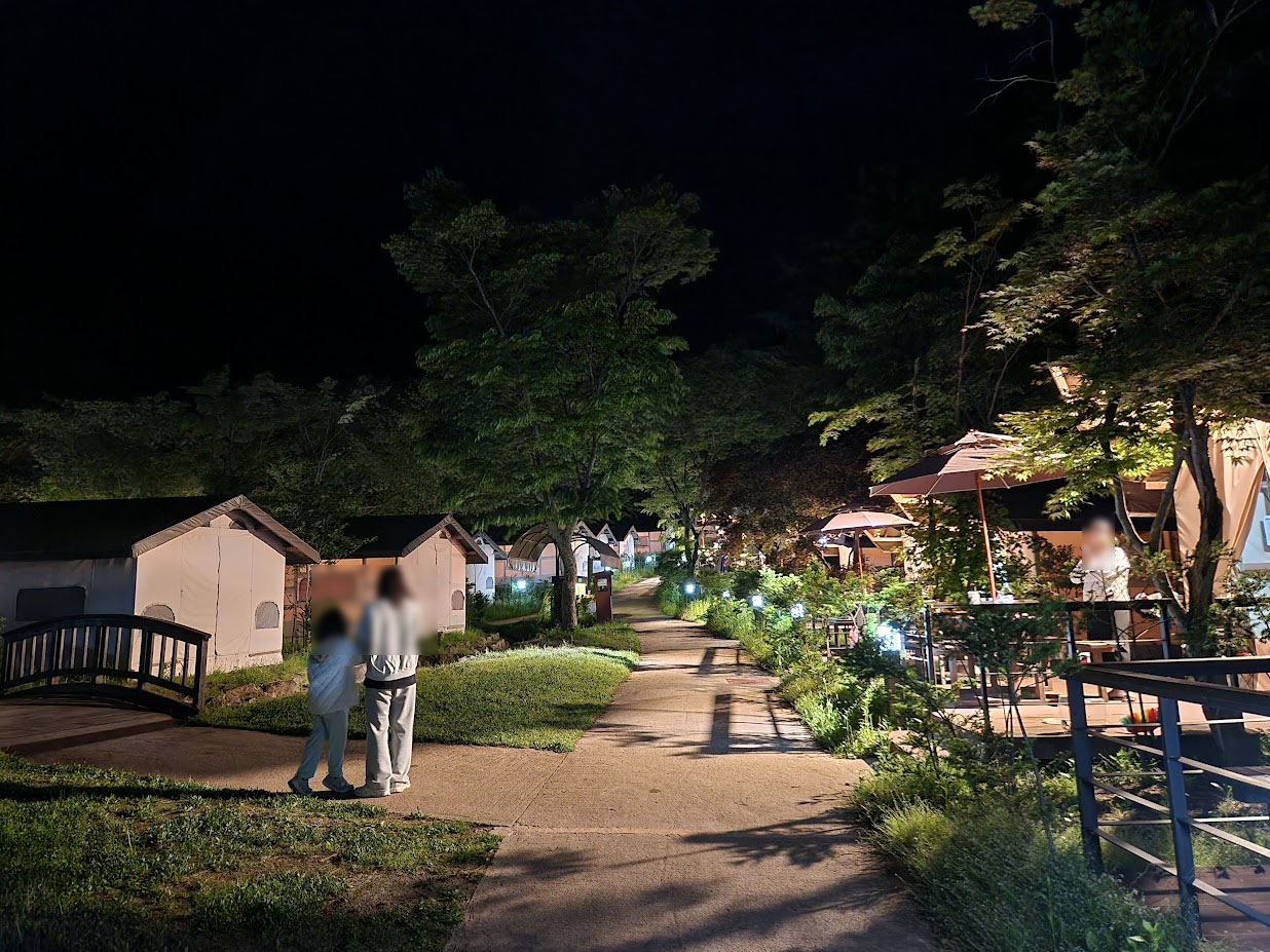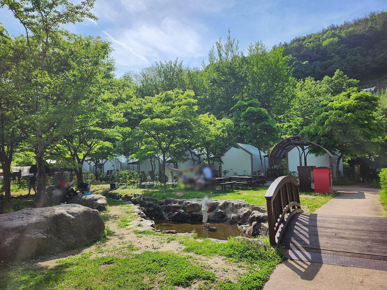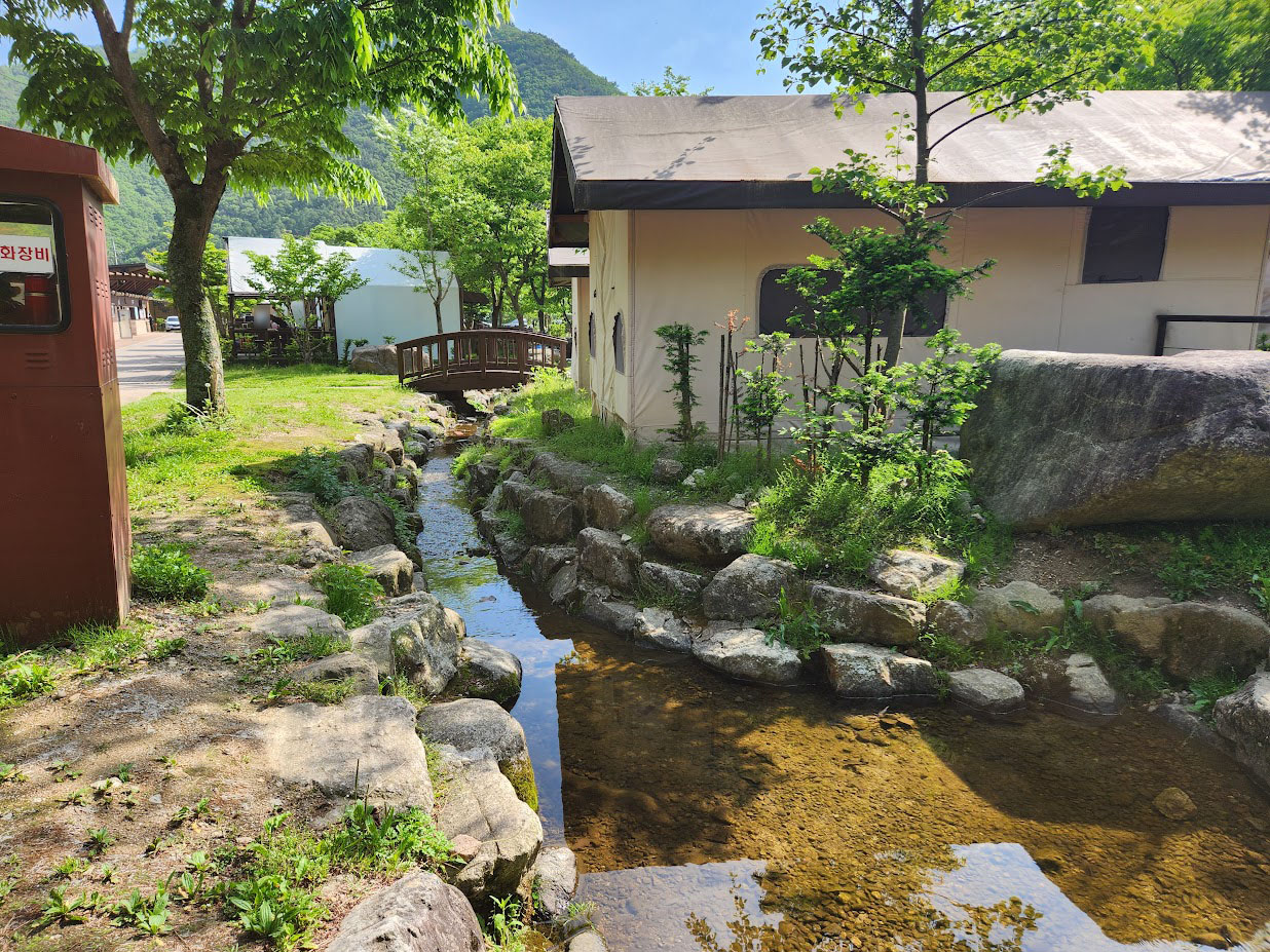 이걸로 끝이 아닙니다. 이 캠핑장은 가운데에 인공적이지만 냇물이 흐르게 해 놓았습니다. 이 덕분에 봄~가을에 어린이들이 정말 놀기 좋은 환경인데, 이번에 갔을 때도 여러 아이들이 잠자리채를 어깨에 걸고 벌레를 잡으러 다니고 개울에서 물장구치며 놀고 있었습니다. 냇가 주변으로는 테이블이 놓여 있는데, 여기에서 캠핑장 주최 체험행사도 열립니다. 정말 어린 아이가 있는 가정이면 놀 거리가 많은 곳입니다. 비슷한 환경의 숲 캠핑장인 월악산 용하야영장보다 환경적인 부분은 좀 열세지만 대신 하우스와 산막텐트라는 시설로 승부합니다.^^