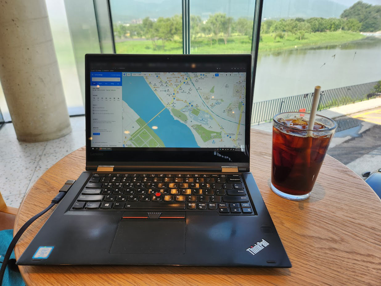 그래도 전반적으로 공간이 넓게 되어 있어서 나름 내부만으로 사진을 찍으면 폼은 납니다. 저는 SNS에 폼나게 사진을 찍을 목적은 아니라 그냥 이정재해장국 사러 왔다 아침 가배 마시러 온 셈이라 30분 정도 가볍게 쉴 생각으로 아이스 드립 커피를 가져와 가볍게 웹 서핑을 하며 시간을 보냅니다. 하지만... 이 사진을 보면 바깥은 이쁘지는 않은데 이게 나름 지금 시기의 문제입니다.