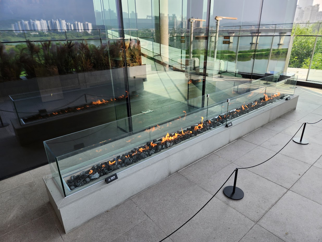 팔당 DT와 달리 옥상 테라스가 없고 그냥 바깥 한강뷰 구경만 가능하게 되어 있는데, 여기서는 불멍도 가능하게 정말 가스불이지만 불도 땝니다. LCD로 구현한 가짜가 아니라 정말 불 맞습니다.
