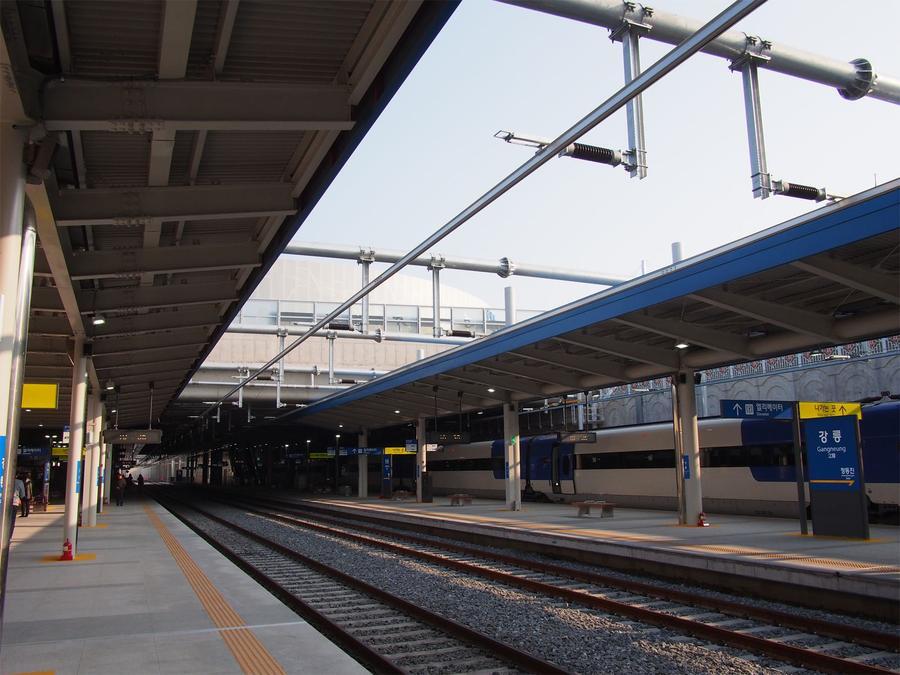 하여간 강릉역 도착. 나중에는(대충 내년 3월 이후) 과거처럼 영동선 무궁화호도 정동진을 거쳐 올라오겠으며 그에 맞춰 플랫폼도 2면 4선(플랫폼 두 개, 선로 네 개)으로 만들어 놓았습니다. 역 자체는 반지하 형식으로 지하 1층에 플랫폼이 있고 1층에 대합실이 있는 구조입니다. 역시 새로 만든 역이라 번쩍번쩍합니다.^^