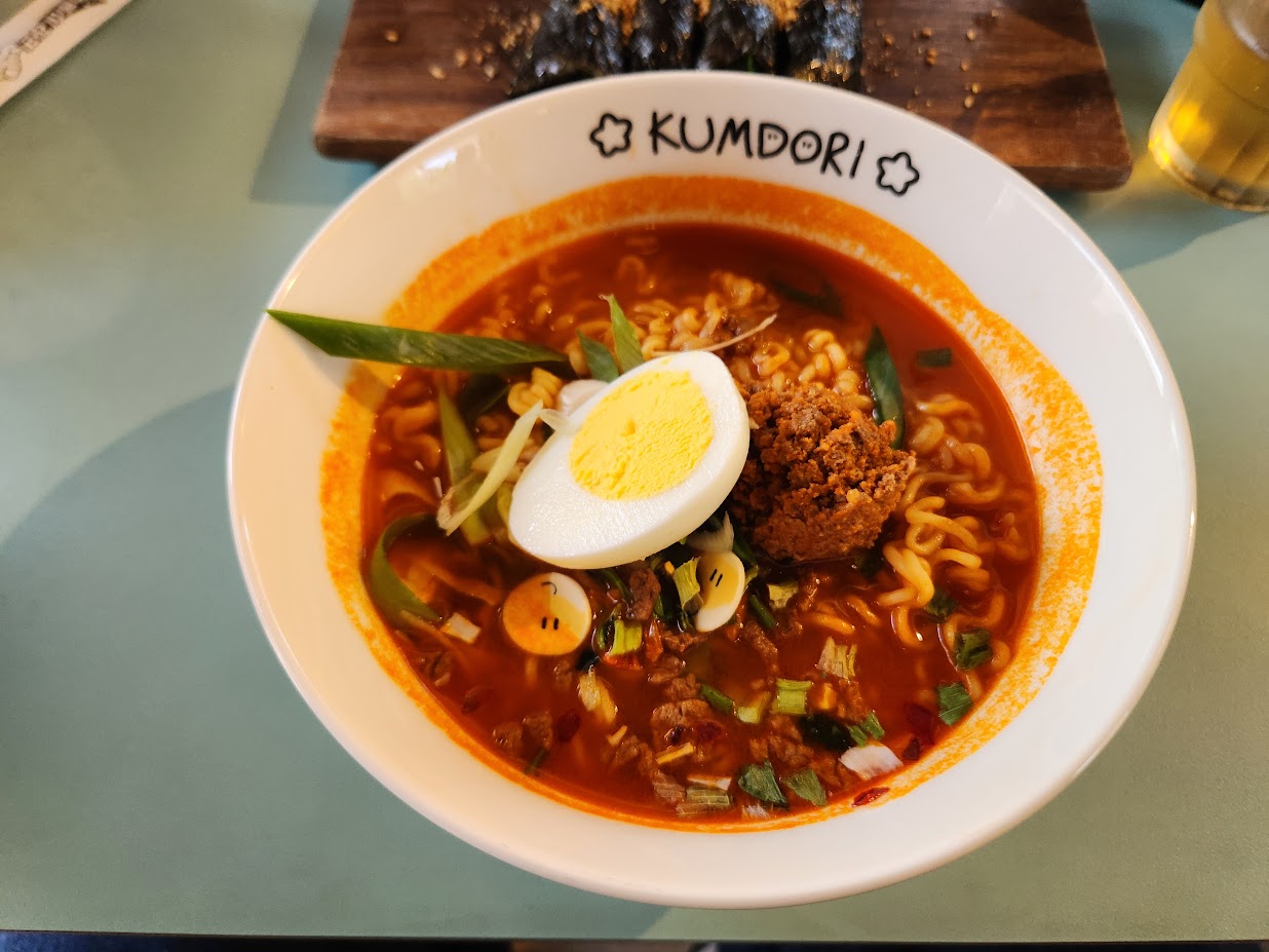 그렇지만 라면은 이야기가 다릅니다. 사실 시판 꿈돌이라면이 그냥 맵기만 한 진라면이라고 욕을 먹는데... 팝업스토어에 나오는 라면은 완전히 딴판인 물건입니다. 라면에 생파와 쇠고기 간 것, 꿈돌이 어묵, 계란 반쪽이 통으로 올라갑니다. 이게 4,500원이니 웬만한 분식집 라면은 명함도 못 내밉니다.