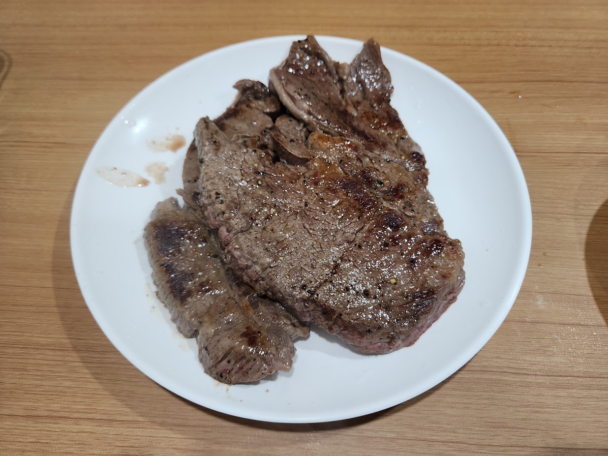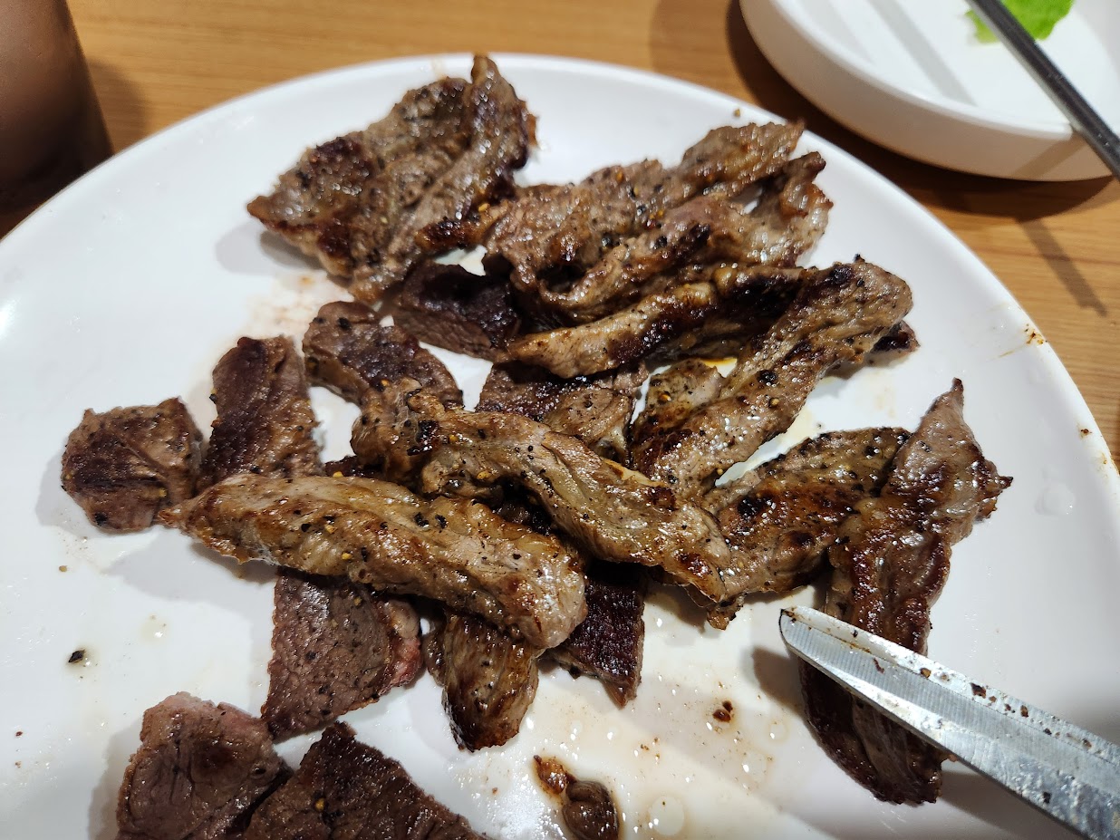 사실 이번 저녁 메뉴는 대전에서 즉흥적으로 골랐는데, 원래는 뭔가 단순하게 먹자는 의견이었으나 결국 육식남이 되고 말았습니다. 가격이 괜찮은 소갈비살과 척아이롤을 골랐는데, 이번에 고른 척아이롤은 목심 비중이 높았는지 적당히 구웠더니 맛이 별도로 웰던 따블(?)을 외치며 바싹 구웠더니 그나마 먹을만한 수준이 되었습니다. 갈비살은 꽤 괜찮은 편이었습니다. 그야말로 밥 없이 고기 + 쌈으로만 먹는 남자의 요리를 즐겼습니다. 이후 배가 꺼질 때 까지 다시 TV를 보고 잠자리에 누웠고, 에어컨을 그야말로 풀가동한 결과 잠은 정말 잘 옵니다.