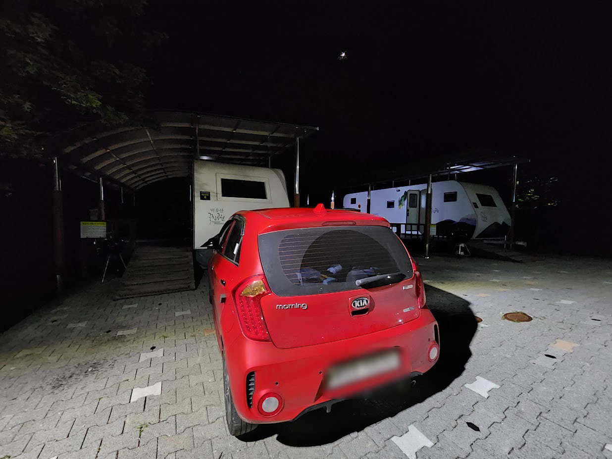 지금처럼 36도는 기본으로 찍는 날씨는 아니더라도 32~33도 수준의 더위에 바깥에서 뭘 하고 싶은 의욕은 들지 않아 닥치고 에어컨을 최대 강도로 틀고 그 아래에서 무주까지 달려온 피로를 풉니다. 가져온 캡슐커피 머신을 이용해 커피를 뽑고 웹 서핑을 즐기며 대전에서 사온 냉동 호떡을 구워 간식을 삼아봅니다. 3시에 딱 맞춰 체크인한 뒤 몸을 살짝 식히고 캠핑장을 한 바퀴 돌고 다시 저녁이 올 때 까지 기절 모드로 진입합니다. 하지만 눕기는 했는데 잠은 오지 않더라는 거...T_T