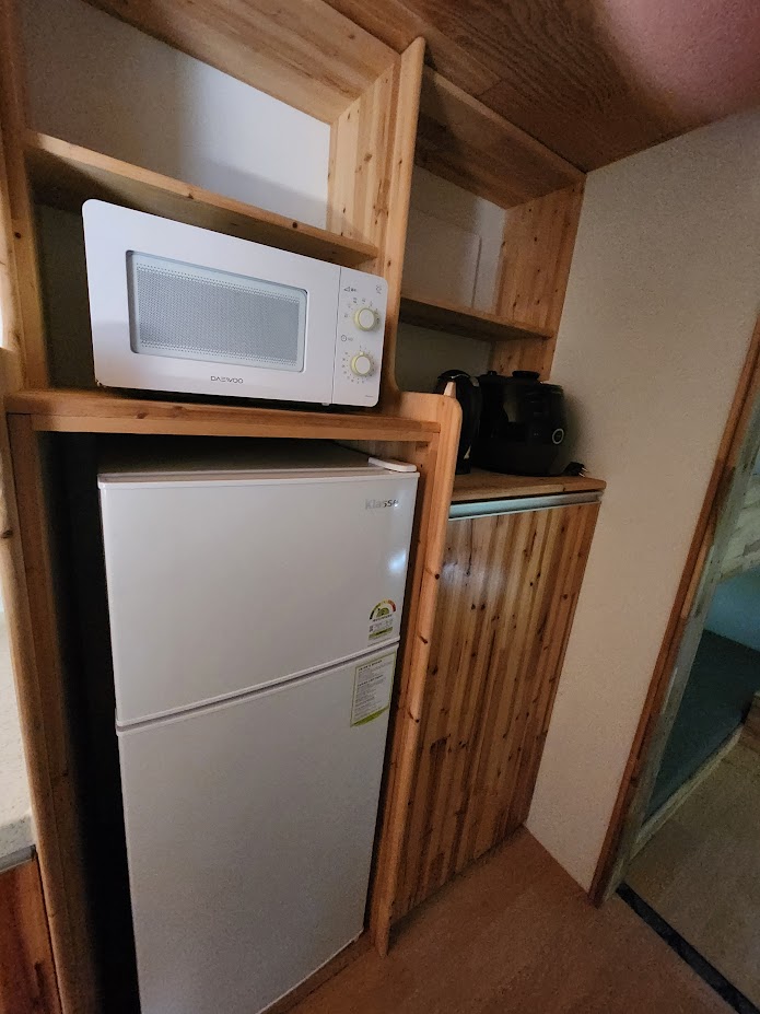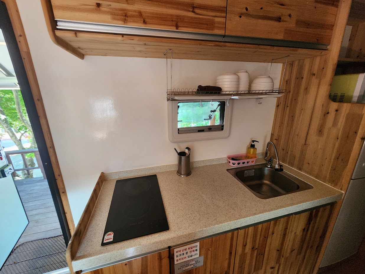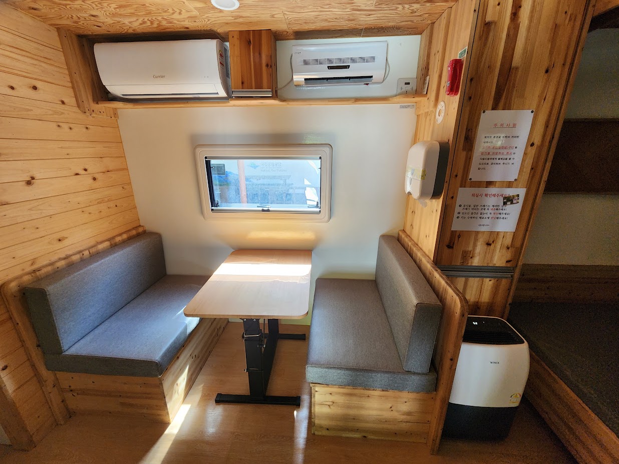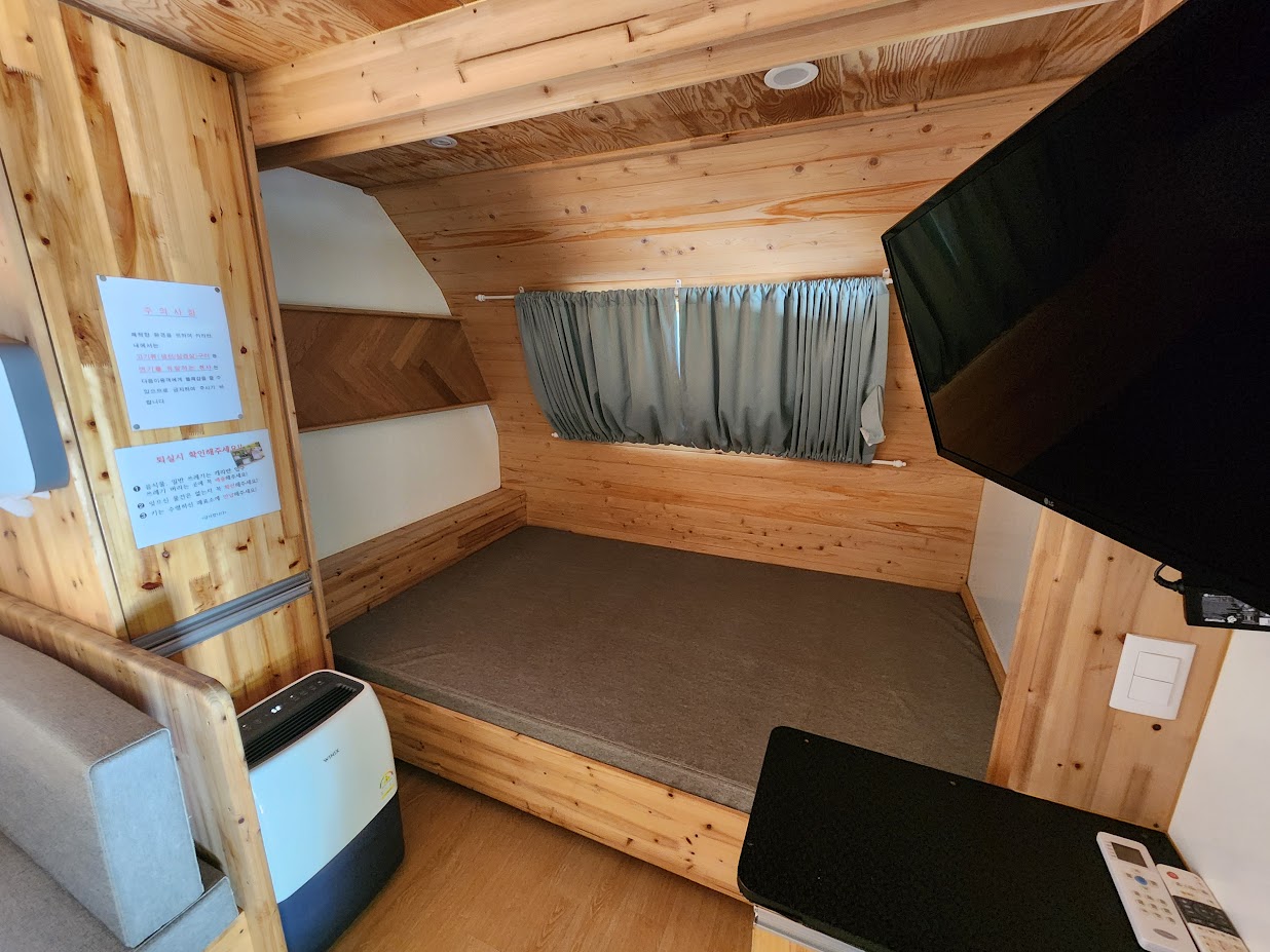 그 이외의 시설은 다른 카라반과 기본적으로 같습니다. 개수대, 냉장고, 전자레인지, 전기포트, TV는 동일하며 여기에 전기밥솥이 하나 더 붙습니다. 또한 동계에 7 영지와 함께 여는 유이한 곳이라 에어컨 이외에도 난방이 되어 있는데, 바닥 난방과 온풍기를 모두 씁니다. 특이하게 에어컨 이외에 제습기가 따로 설치되어 있는데, 에어컨이 제습기 역할을 하지만 에어컨은 또 온도를 낮춰서 계속 돌리지 않으면 제습 효과가 없다보니 온도가 너무 낮으면 잠을 못 자는 분이 계실 경우 에어컨만으로는 제습이 안 되어 꿉꿉한 밤을 보내야 합니다. 이 점에서 제습기가 따로 있는 것은 반가운 일이 아닐 수 없습니다.