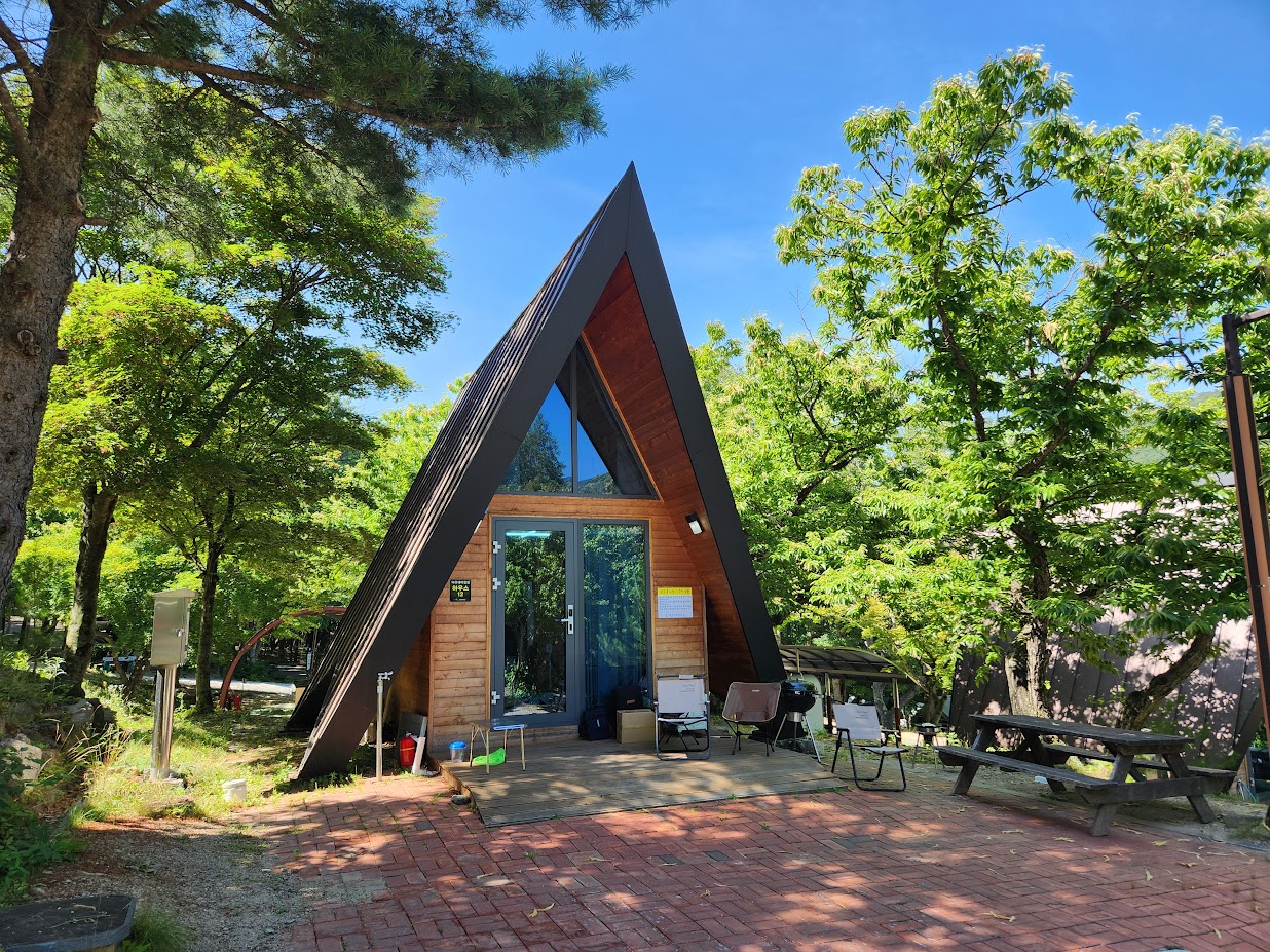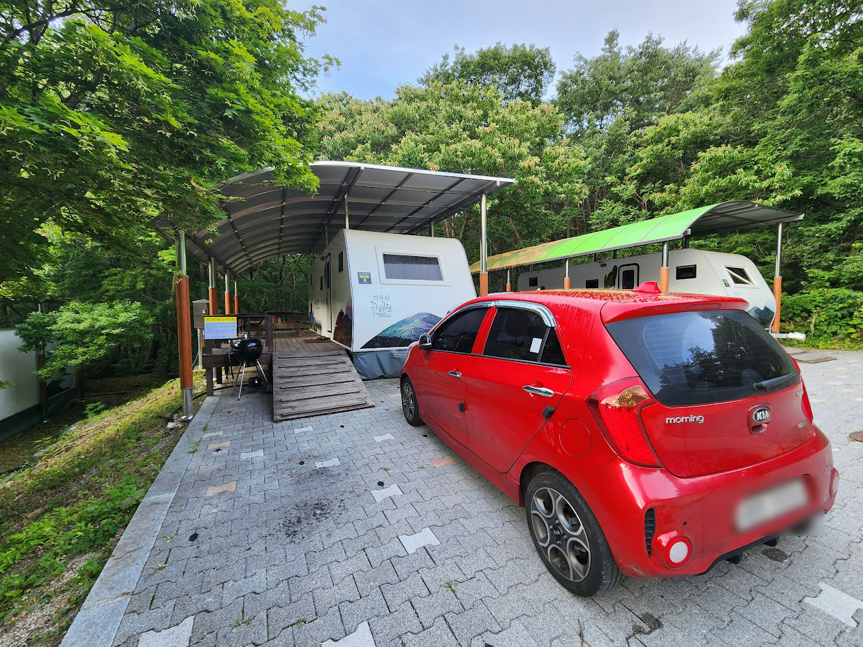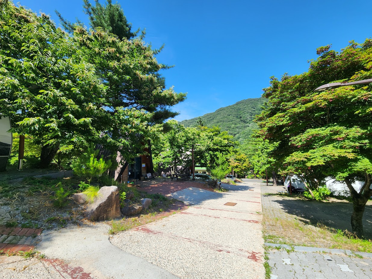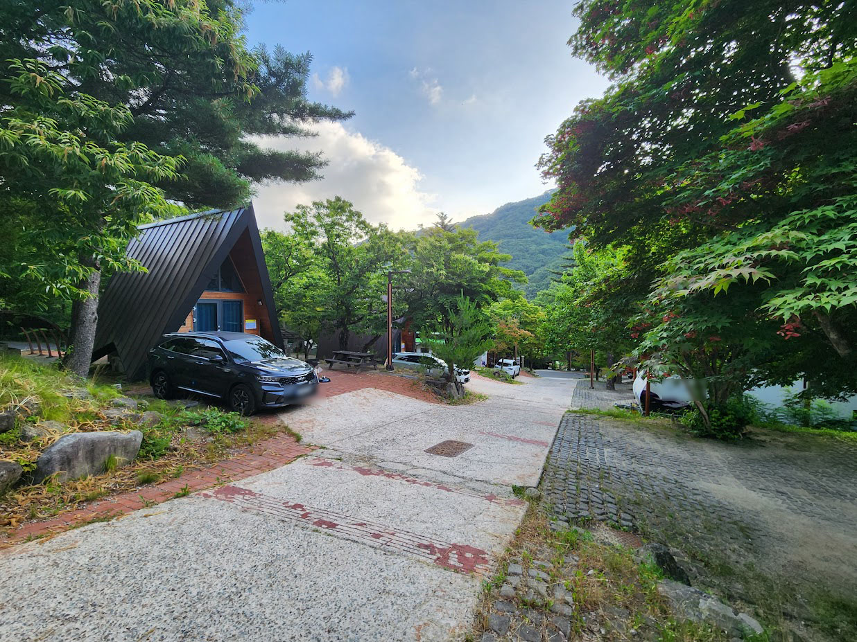 그러면 이제 주말을 보낼 곳을 살펴봐야죠. 캠핑장 입구 냇가에 있는 7 야영장을 지나 등반로와 분리되는 구간의 헤어핀을 돌아 언덕을 오르면 가장 먼저 보이는 곳이 이 카라반/하우스 영지입니다. 도로에서 왼쪽이 주로 카라반, 오른쪽이 하우스입니다. 보통 다른 캠핑장의 카라반은 4인 기준이지만 여기는 6인 카라반이 따로 있고, 하우스도 종류가 상당히 다릅니다. 산막텐트 구조인 것도 있는 반면 통나무집 구조인 것도 있고 심지어 똑같은 하우스인데 시설도 다릅니다. 예를 들어 산막텐트는 에어컨이 없고 통나무집은 에어컨이 있습니다. 심지어 가격도 다르니 여기에 편한 캠핑을 생각하신다면 미리 좀 알아보고 잡으셔야 합니다. 추가적으로 하우스는 카라반 영지에 있는 딱 두 동을 제외하고는 주차장과 하우스가 분리되어 있습니다.