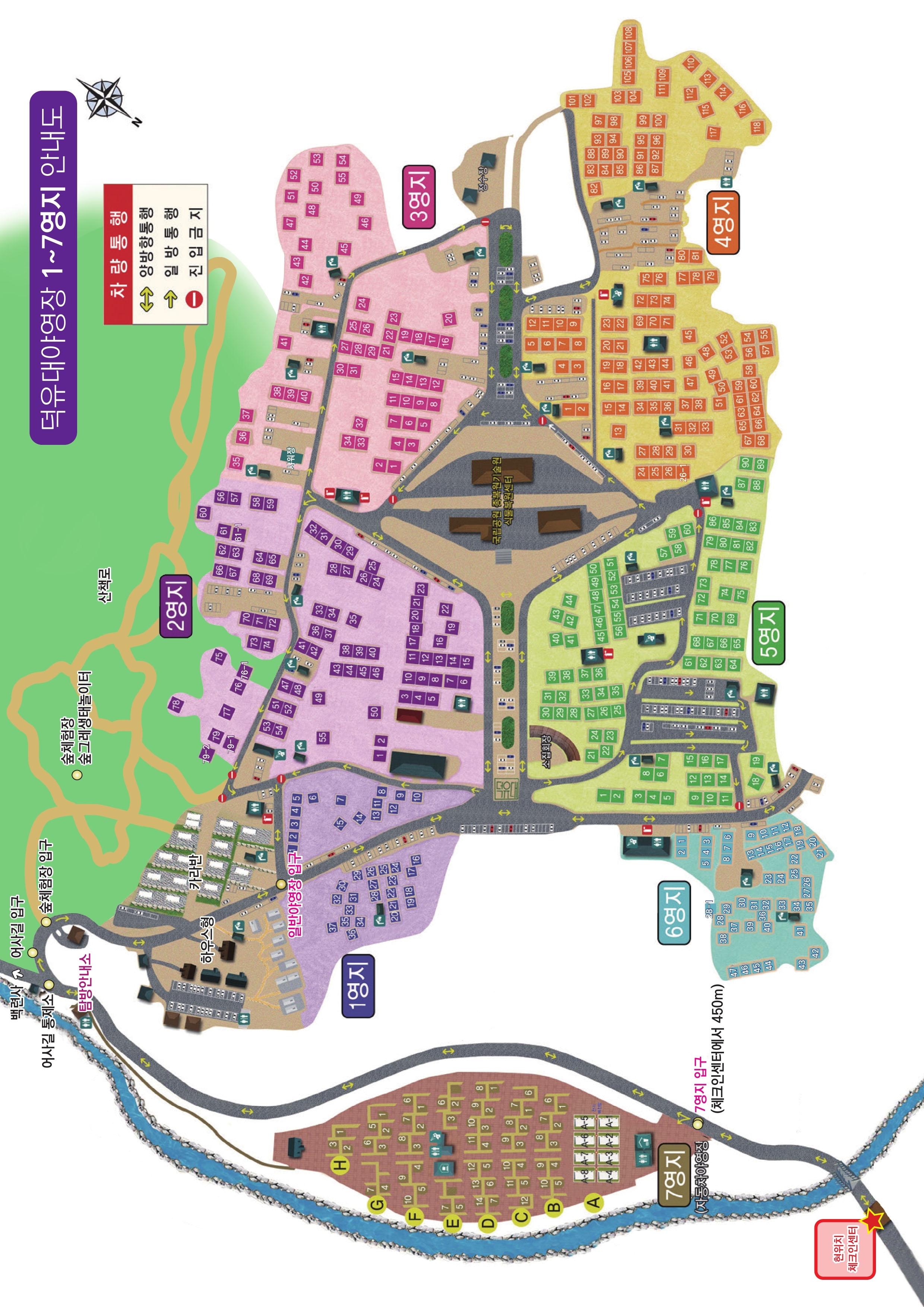 일단 이게 영지 지도입니다. 국립공원공단 홈페이지에 기재된 안내도는 이것과 그냥 반대로 되어 있을 뿐인데... 이렇게만 보면 숲속에 넓게 펼쳐진 캠핑장으로 보이지만 실상은 그렇지 않습니다. 실상을 이해하려면 지도를 먼저 이렇게 돌려 보셔야 합니다.