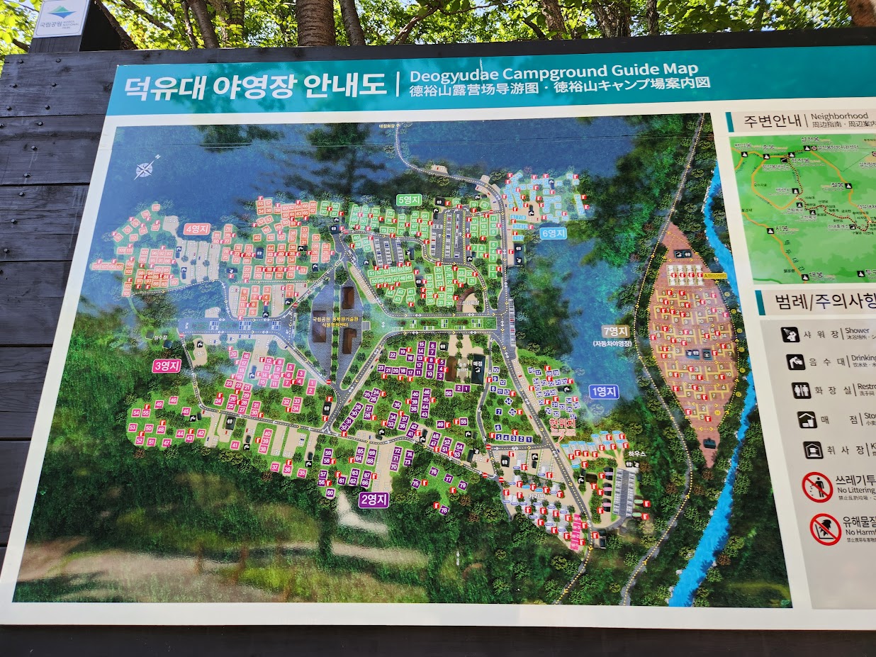 덕유대야영장은 그 규모면에서는 국공립, 그리고 민영을 합쳐도 최대 규모라 할 수 있습니다. 내부적으로는 일반 영지를 1~7 야영장으로 쪼개 놓긴 했지만 그 각각이 중형 캠핑장 수준이고 사실상 이게 한 몸이라 실제로는 500개 이상의 영지를 가진 초대형 캠핑장인 셈입니다. 그야말로 국내 캠핑의 성지라 할만한데... 실상은 좀 마니아틱한 캠퍼들이 아니면, 즉 캠핑 초보자들에게는 처음부터 권해드릴만한 곳은 아닙니다.