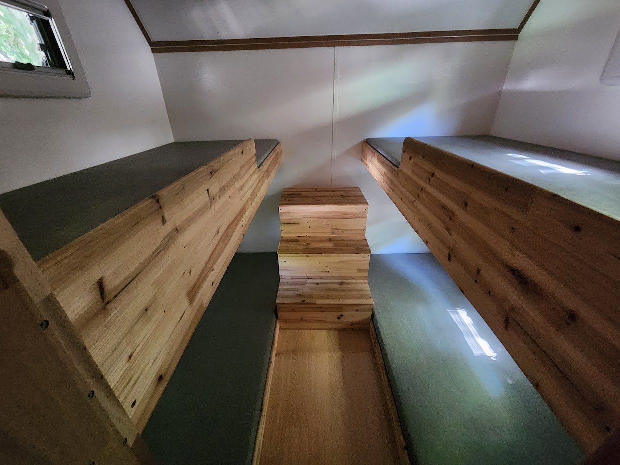 그러면 내부는 어떨까요? 사실 4인이나 6인이나 큰 틀에서 차이는 없습니다. 보통 4인은 더블베드 하나, 싱글베드가 2층으로 하나가 되어 있는데, 6인은 싱글베드 구성은 동일하며 싱글베드가 별도의 침실을 구성해 4개가 있습니다. 싱글베드는 침대에 개별조명과 콘센트가 있어서 전기 싸움을 할 필요는 전혀 없습니다. 침대는 전부 폼 매트리스가 깔려 있어 다음날 허리를 붙잡을 필요도 없습니다.