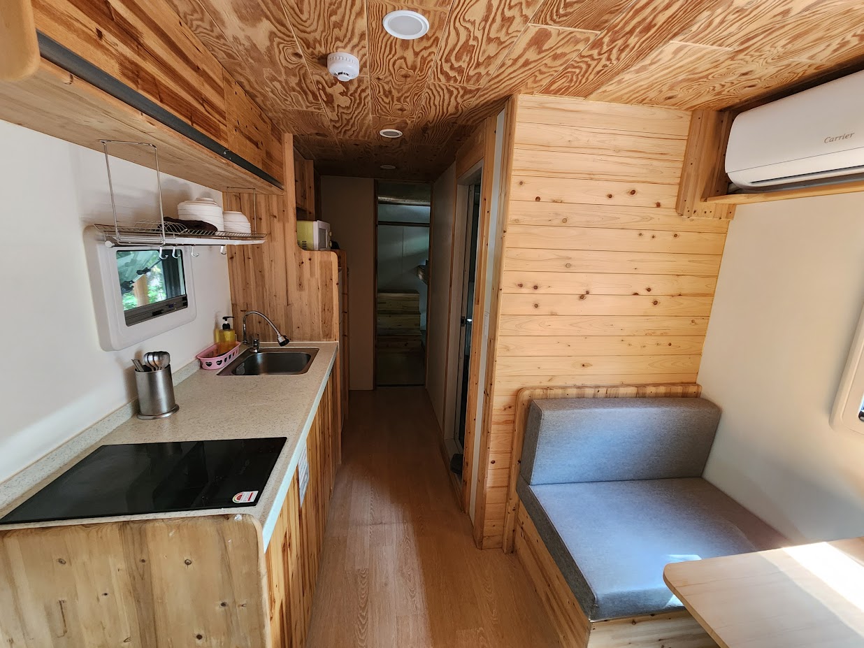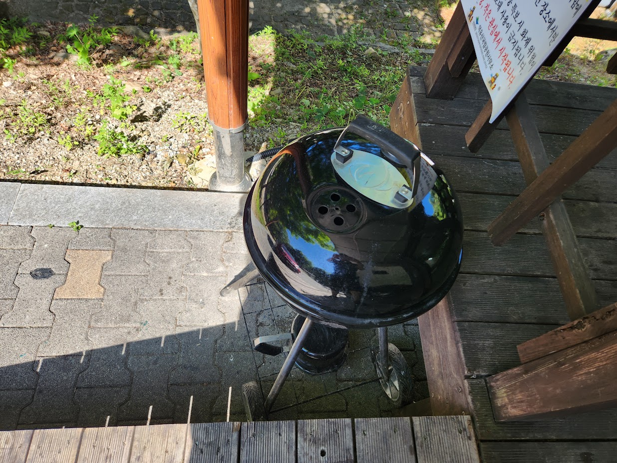 외부 시설은 다른 카라반과 큰 차이는 없습니다. 외부는 캐노피가 되어 있어 나무 테이블 바깥 야외 활동을 하는 데 웬만한 비가 와도 큰 어려움은 없습니다. 또한 화로대 대신 BBQ 그릴이 데크 바깥에 배치되어 있습니다. 화재 예방을 위해 그릴을 밖으로 빼둔듯 합니다만 이 때문에 우천시 화로대 이용은 어렵습니다. 사실 비가 오면 얌전히 실내 조리를 하시는게 낫죠.