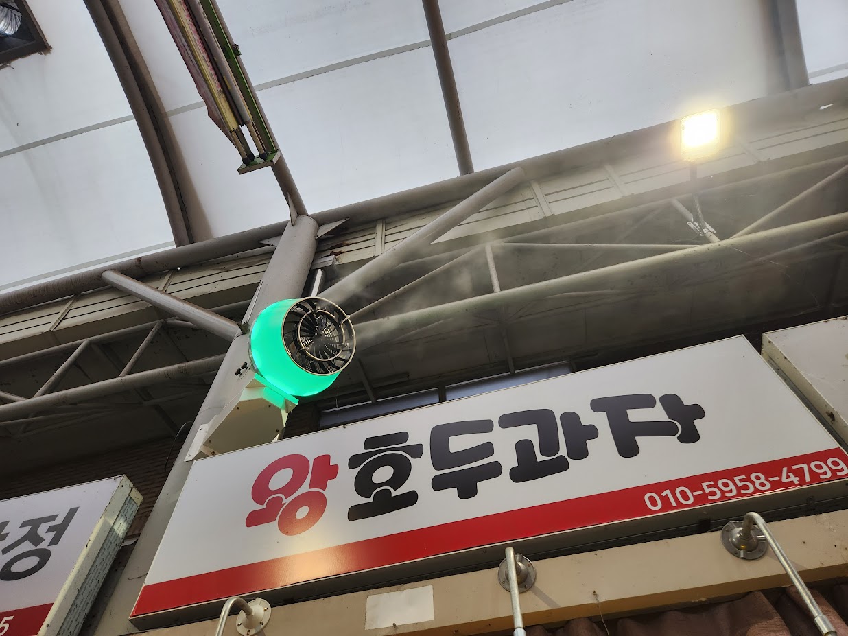 그렇다고 무슨 시장 통로 전체에 문 달고 에어컨을 켤 수도 없는 것. 그래서 시장에서 내놓은 방안이 바로 위 시장 입구 LED 간판 아래에 달린 무언가입니다. 예. 요즘 버스정류장에 달아 놓는 '쿨링 포그'입니다. 뭐 대단한건 아니고 그냥 물을 분무기로 가늘고 세게 뿌리는거죠. 시장 입구에는 이런 식으로 에어 커튼 효과를 내게 아래로 뿌립니다.