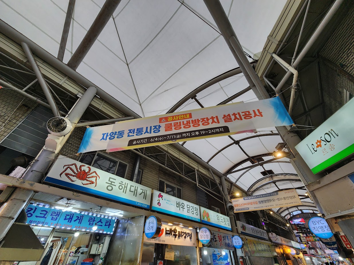 사실 이 자양시장에는 나름 추천할만한 집들이 몇 곳 있고 단골집도 있습니다만 그건 다른 포스팅에 적기로 하고 오늘은 시장의 '하드웨어' 업그레이드 이야기입니다. 사실 전통시장의 단점을 한두가지로 꼽을 것은 아닙니다만, 앞부분에 적히는 내용 가운데 하나가 '기후 문제'입니다. 즉 덥고 춥고 비오고 눈오면 불편하다 이거죠. 사실 이 문제는 건물 안에 있는 마트를 시장이 뭔 짓을 해도 못 뛰어 넘는 부분입니다. 그나마 비나 눈은 시장에 아케이드를 만들면 막을 수 있고 바람도 마찬가지지만 그래도 덥고 추운건 답이 안 나오죠. 추운건 절반이 바람이라 아케이드에 있으면 좀 낫지만 아케이드는 오히려 더위에 취약합니다. 예. 좁은 곳에 바람도 잘 안 통하니 푹푹 찌죠.T_T