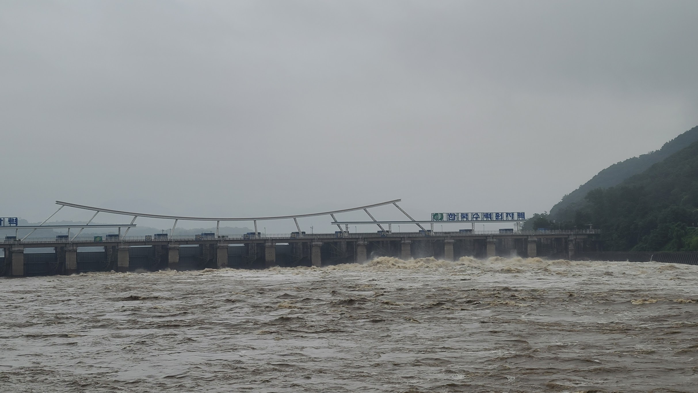 예. 예상대로 팔당댐은 나름 콸콸 수문을 열고 흙탕물을 뿜고 있었습니다. 물구경은 나름 즐겁지만 이 물이 다 누군가에게 피해를 준 물이라는 점을 생각하면 마음 한켠이 매우 편하지는 않습니다. 일하다 말고 도망온 저처럼 말입니다.T_T