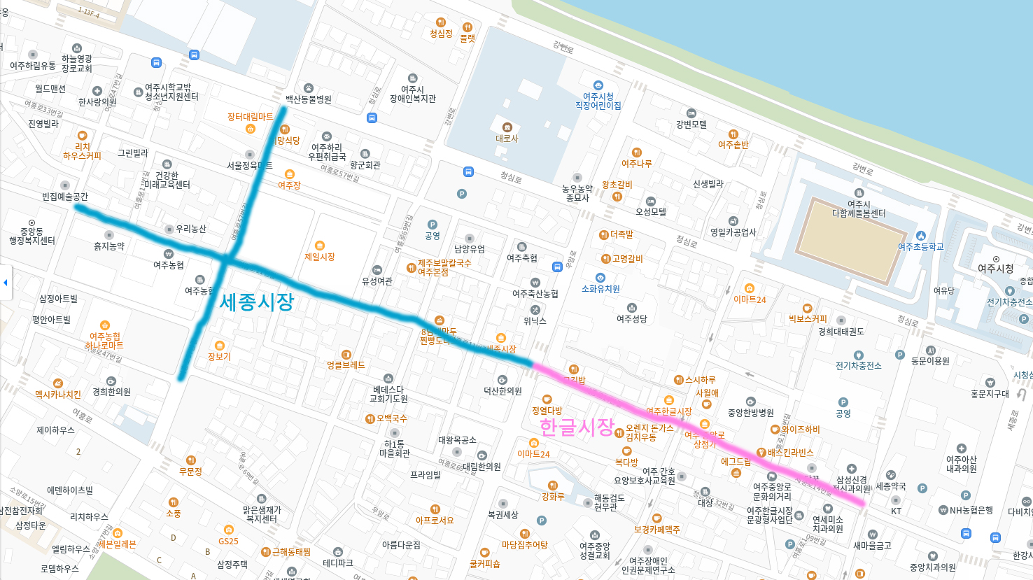 나름 10만명이 사는 동네에 상설시장이 제대로 된 것이 없다면 그것도 나름 문제겠죠. 여주장은 여주 읍내의 두 개의 시장, 즉 세종시장과 한글시장에 5일장 한정으로 노점이 추가되는 형태로 열립니다. 어차피 세종시장과 한글시장은 그냥 길 하나 건너 너머에 있는거라 사실상 사람들 입장에서는 그냥 하나로 볼 수 있는 것이기에 상인회 관계자가 아니라면 딱히 구분할 필요도 없습니다.