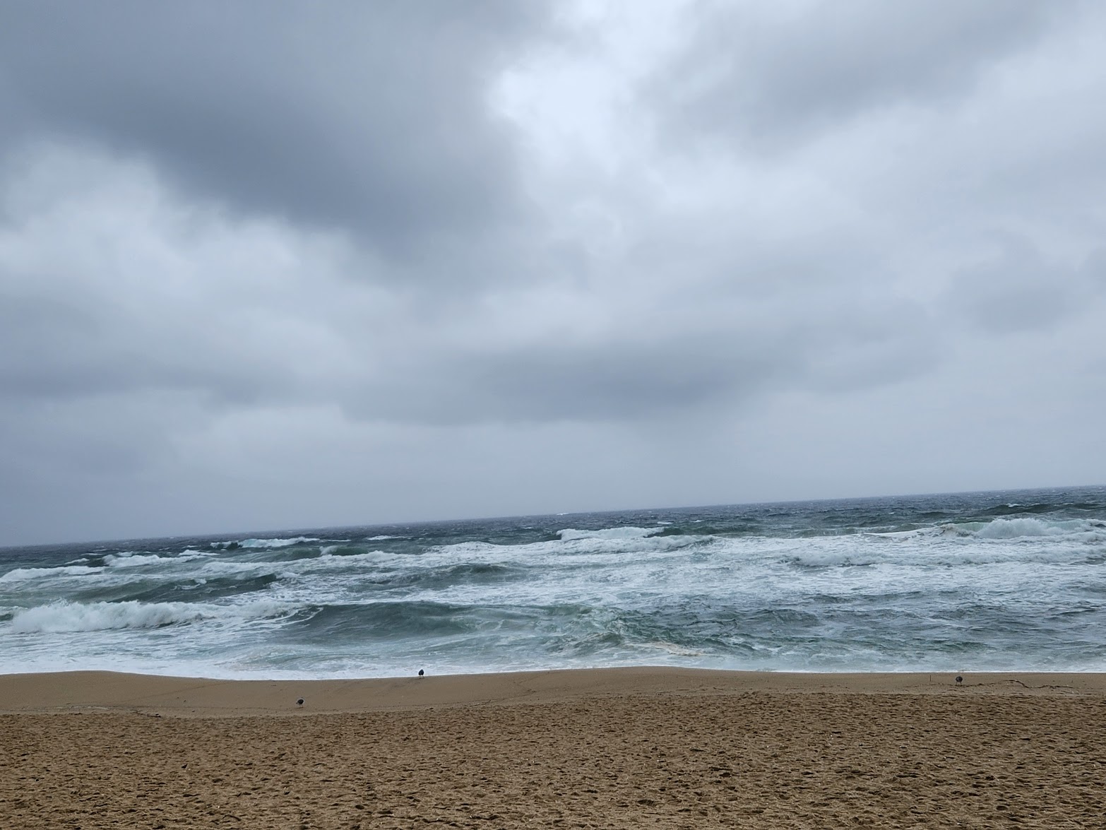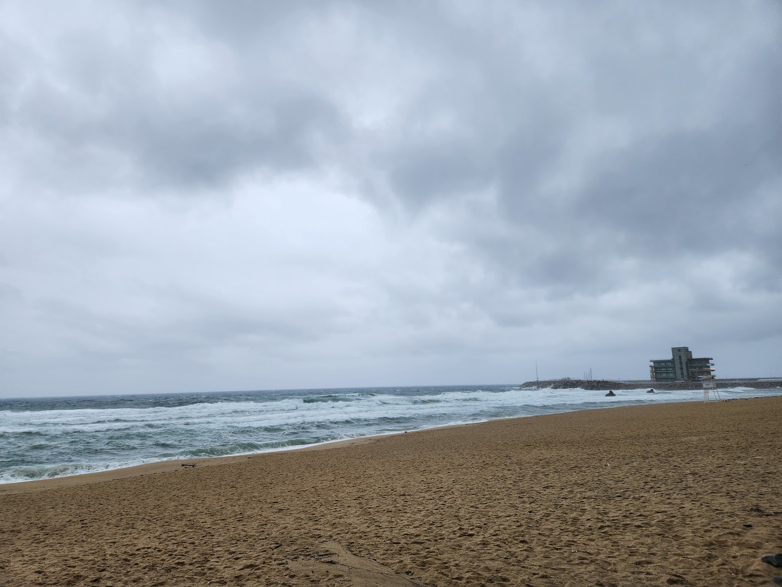 다만 대관령터널을 들어가기 전 까지만 해도 내리지 않던 비가 터널을 지나자 꽤 뿌리기 시작합니다. 우산을 잘 가져왔다 생각하고 역에서 나오는데... 문제는 그런 차원이 아니었습니다. 진짜 문제는 바람. 사실 비는 이 때까지만 해도 그렇게 강한 편은 아니었으나 바람이 거세 우산을 쓰기도 힘들었습니다. 그렇게 안목 해변에 도착하니...