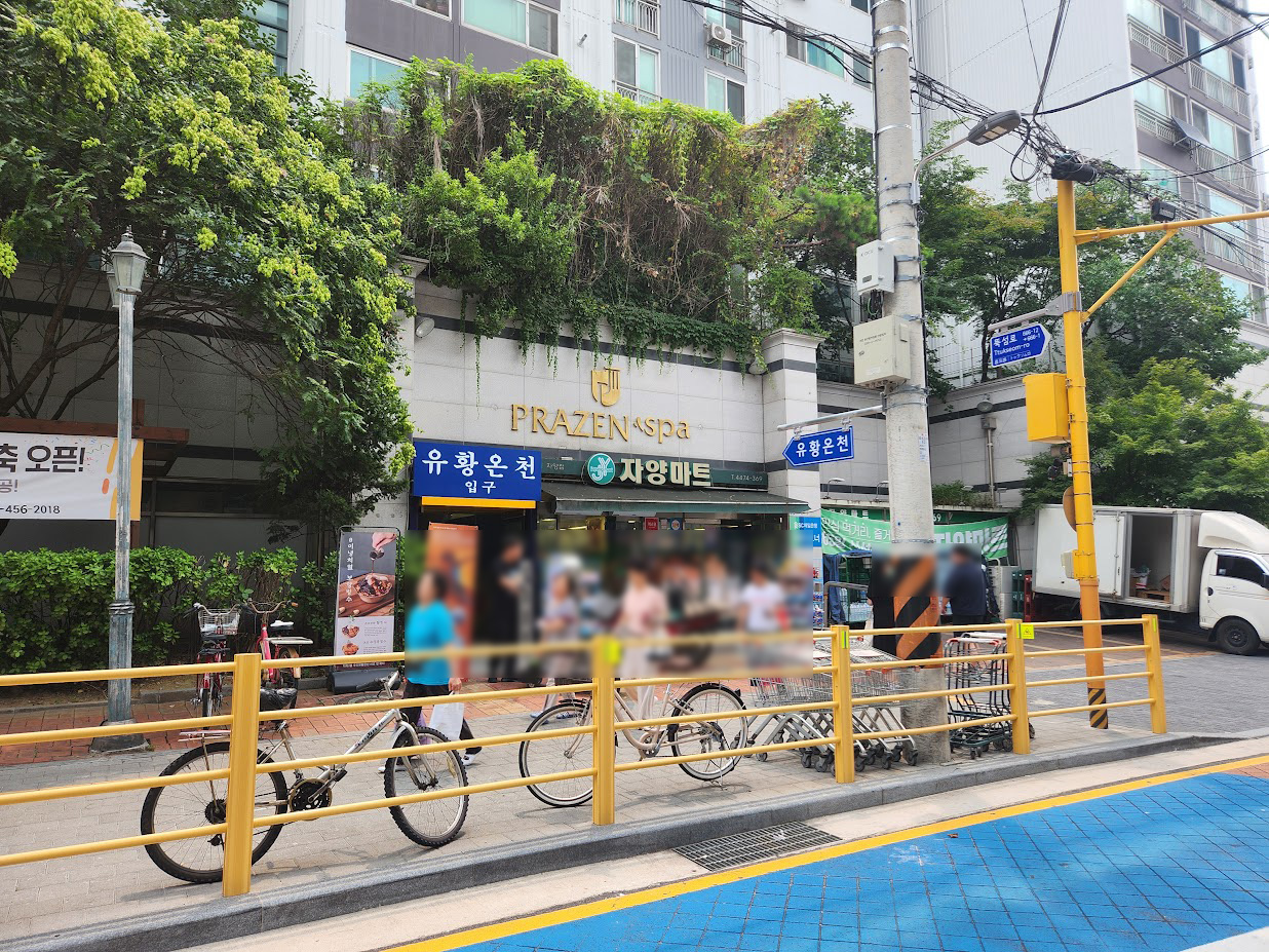 이 온천 위에 있는 아파트 이름이 'YM프라젠스파아파트'인데, 온천 위에 있다보니 주변 소문은 '온천수가 나오는 아파트'라 하지만 실상은 그런 거 없다고 합니다.T_T 그래서 1층에 온천 이름이 '프라젠 스파'라 되어 있는데 정작 이렇게 부르는 사람은 없습니다. 그냥 아파트 이름이 이렇다고 생각할 뿐이죠. 도보로 오셨다면 1층에는 수퍼마켓이 눈에 띄는데, 그냥 동네 수퍼마켓이라 엄청나게 특이할 것은 없습니다만, 목욕을 하고 음료나 아이스크림이 땡길 때는 이 수퍼마켓을 이용하시면 지갑 부담이 꽤 줄어듭니다.