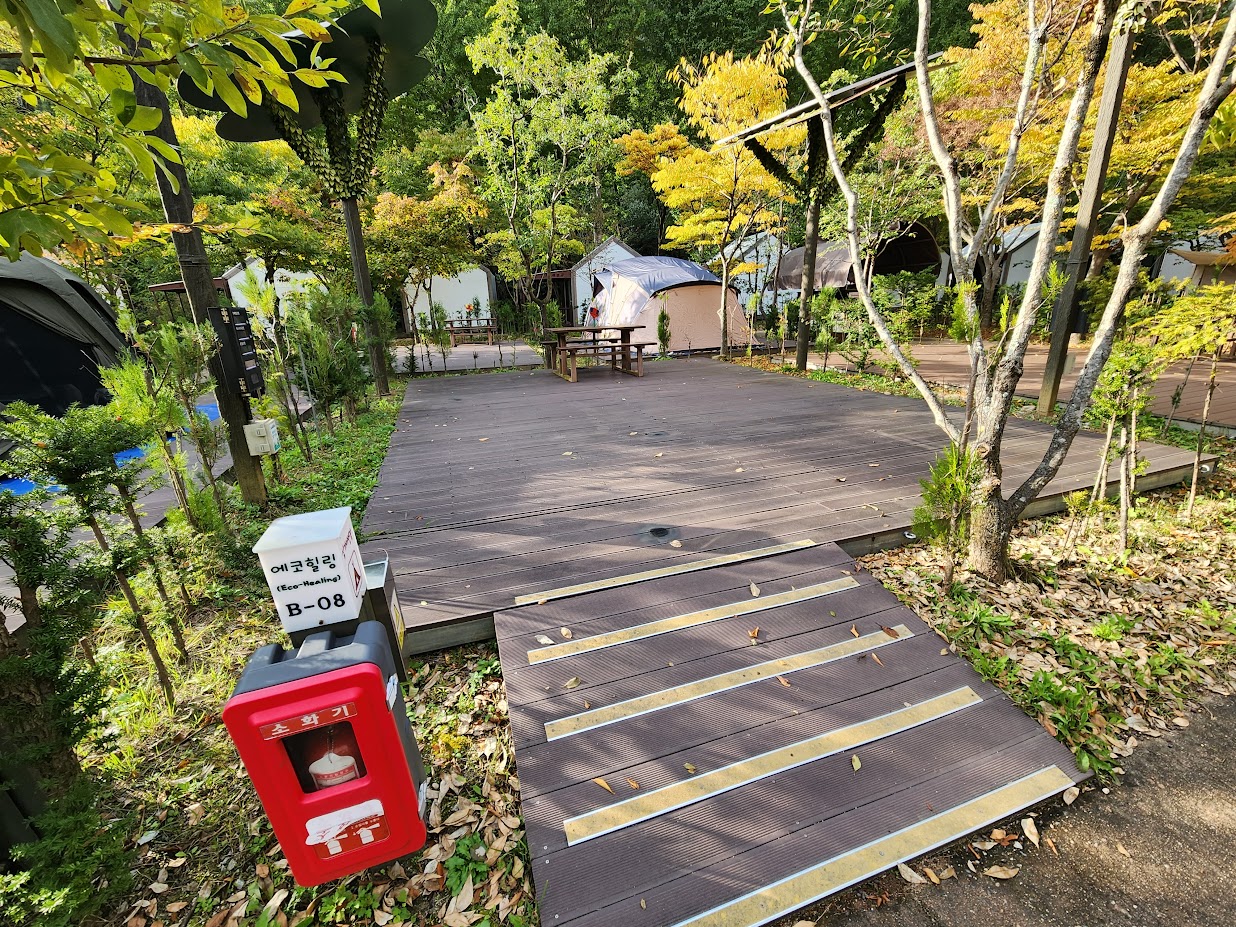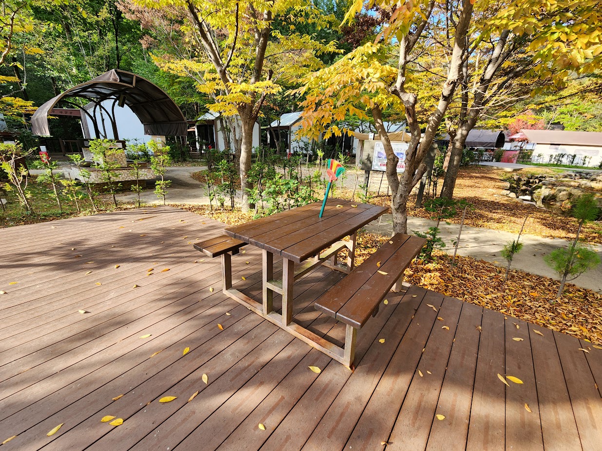 일단 봄과 안 바뀐 부분, 즉 일반 영지만 쓱 먼저 보고 가죠. 이 캠핑장은 일반 캠핑보다는 하우스와 산막텐트 위주라서 일반 영지는 덤으로 취급받는 경향이 있습니다만 그래도 총 영지 수는 9개씩이나 있습니다. 이 가운데 데크가 7개, 그냥 맨땅(마사토)가 2개입니다. 이 데크 영지에서 3개는 무공해 영지, 즉 대중교통이나 전기차/수소연료차를 가지고 온 사람만 예약이 되니 주의가 필요합니다. 또한 영지의 크기도 미묘하게 조금씩 다르니 예약 시 역시 또 주의를 해야 합니다. 돔텐트는 아무 걱정이 없으나 대형 거실형 텐트를 쓰거나 대형 타프를 칠 분들은 참고가 필요하겠죠. 시설은 다른 캠핑장 일반 영지와 마찬가지로 그냥 땅/데크 + 나무 테이블을 제공하고 전기는 영지에 하나씩 제공됩니다.