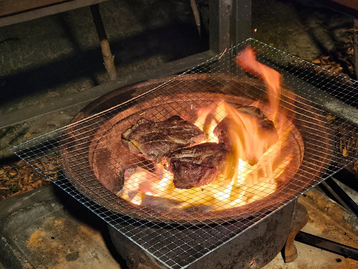 화로대에 숯과 장작을 집어 넣고 열심히 불을 때고 연기가 최대한 안 날때까지 숯을 태워준 뒤 그제서야 고기를 올립니다. 숯불 직화는 보기 좋고 향도 좋고(뽜이야~) 맛도 좋지만 맛을 좋게 하려면 손이 많이 갑니다. 그대로 구우면 겉만 타고 속은 익지 않으니 온도 조절을 해가며 구워야 하고, 중간중간 적당한 크기로 잘라서 구워야 합니다. 이렇게 구우면 사실 육즙은 좀 아쉽지만 대신 정말 두껍게 씹히면서도 바삭한 맛이 일품입니다. 숯불의 향도 잘 입혀져 정말 쓱쓱 입으로 들어갑니다. 남은 것 없이 싹 털어 먹었습니다.