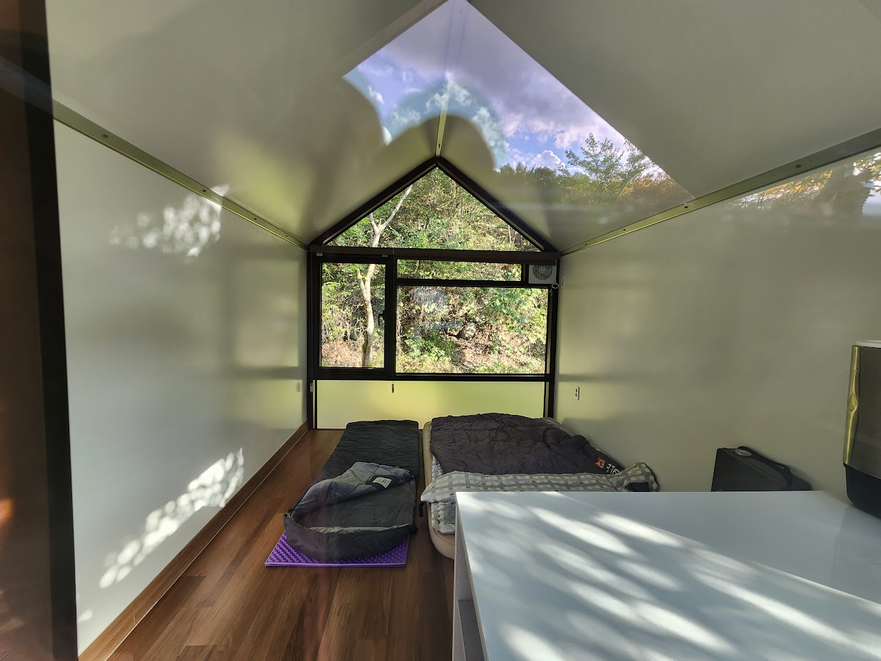 이게 삼가야영장의 하우스입니다. 보통 하우스로 불리는 목제 구조와는 좀 다른, 일종의 하우스와 산막텐트의 중간적인 형태에 가깝습니다. 벽 부분은 목제가 아닌 천으로 되어 있기 때문입니다. 물론 앞뒤쪽은 제대로 된 유리로 되어 있습니다. 산막텐트에 비해서는 햇볕이 잘 들어 개방성이 있는 구조입니다. 별도의 냉방 기구는 없으며 실내에는 아이스박스만 제공됩니다. 대신 바닥은 전기난방을 제공합니다.