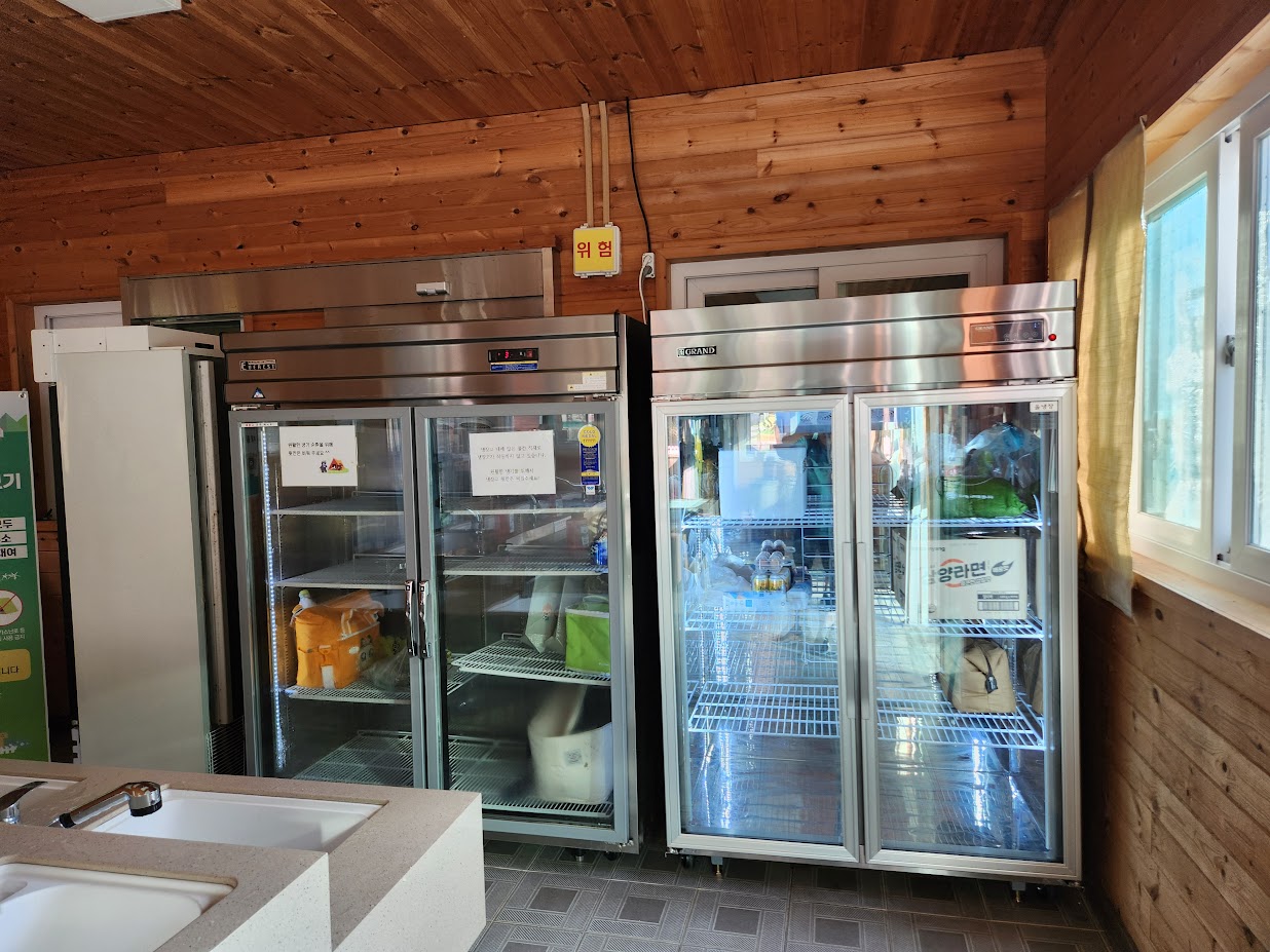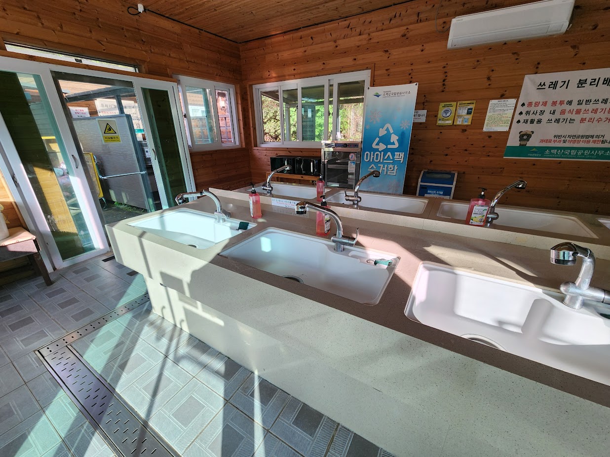 삼가야영장은 나름 개수대가 장점으로 꼽힙니다. 주차장쪽에 실내 개수대와 화장실, 샤워장이 몰려 있는데(화장실은 구석에도 있습니다.), 실내 개수대는 집의 싱크대와 구조가 같으면서도 세제와 수세미까지 제공해줍니다. 따뜻한 물도 그런대로 잘 나옵니다. 여기에는 전자레인지 2대, 공용 냉장고 2대, 식기 살균기까지 놓여 있어 식품 보관이나 냉동식품 조리도 편합니다. 안쪽 영지에서 거리가 먼 것이 아쉽지만 그래도 툴툴거리며 충분히 올 정도 거리는 되니 큰 불편은 아닙니다. 심지어 화로대 세척 공간도 개수대 바깥쪽에 따로 두고 있으니 정말 화로대를 제대로 쓰라고 있는 캠핑장이라 할 수 있습니다.