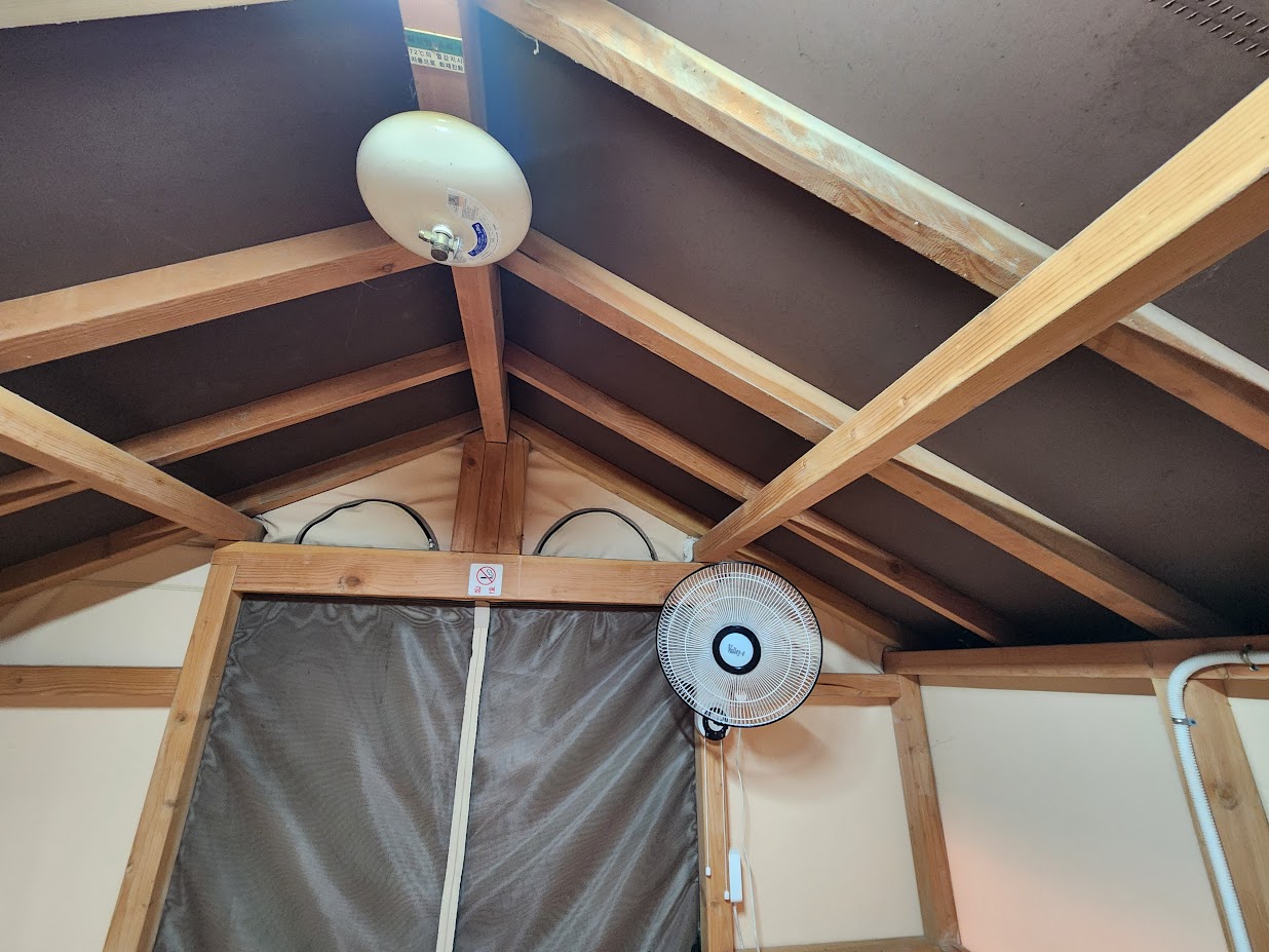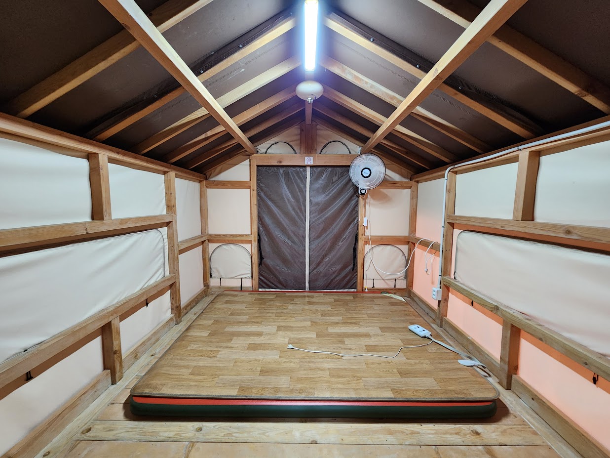 반대로 산막텐트는 겉보기에도 일단 텐트같습니다. 물론 실제로는 하우스와 비슷하게 나무 프레임이 천을 씌워 놓은 형태라 하우스와 큰 차이는 없습니다. 대신 제대로 문과 창문이 달려 있는 하우스와 달리 입구는 그냥 텐트와 똑같으며, 내부의 창문도 텐트와 똑같아 하우스같이 탁 틔인 느낌은 없습니다. 대신 선풍기가 기본적으로 달려 있으며, 바닥 난방 대신 에어매트와 전기장판이 비치되어 있어 춥게 잘 걱정은 하지 않으셔도 좋습니다.