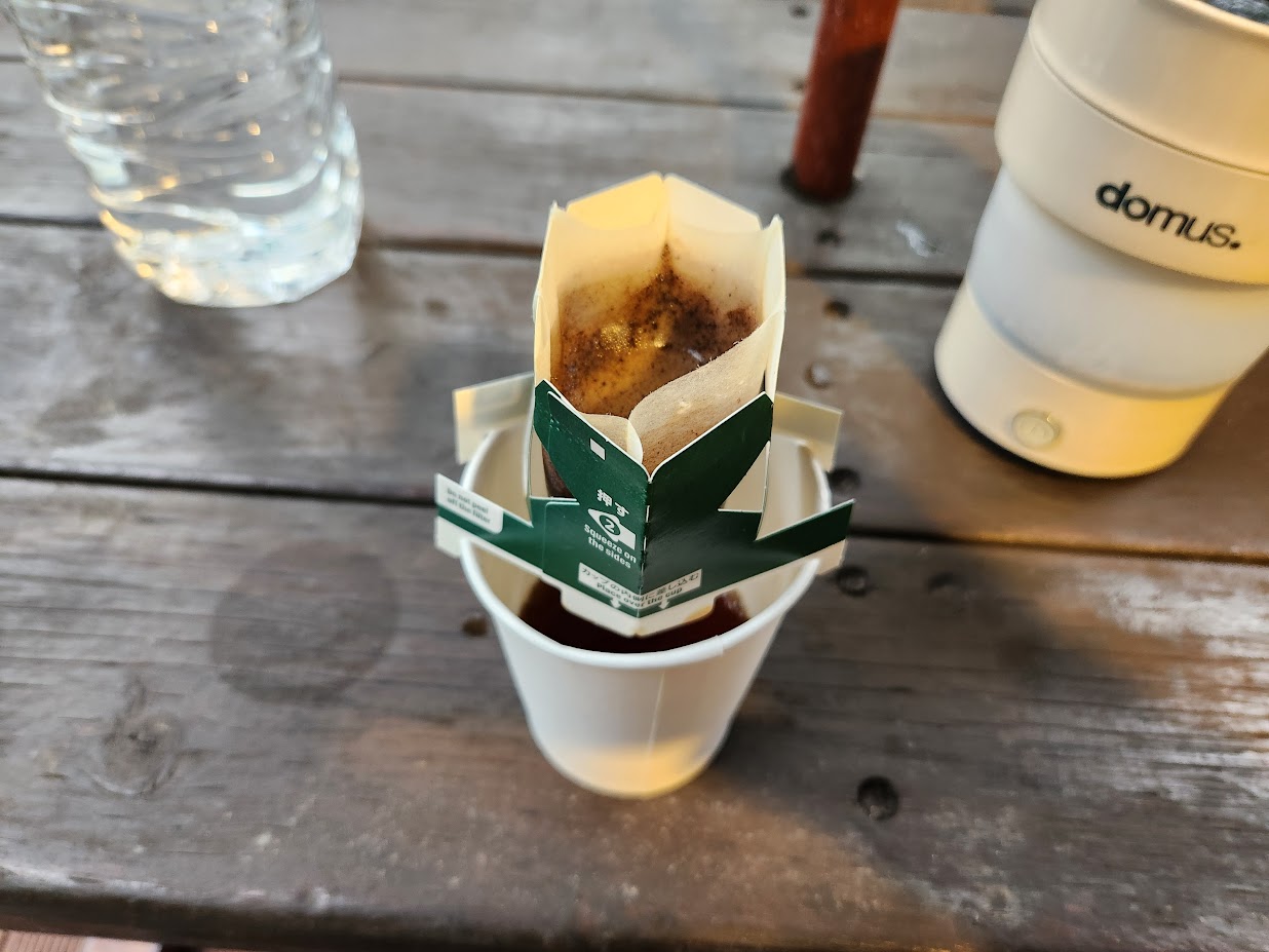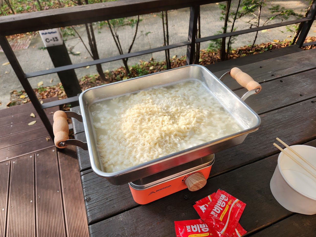 텐트를 칠 필요가 없으니 후딱 실내를 정리합니다. 이불 깔고 놀 준비만 하면 끝~ 그리고 요리사(?)에게 늦은 점심밥을 대령합니다. 밥은 간단하게 그냥 비빔면. 화력 좋은 부르스타(?)에 물을 재빨리 끓이고 면을 삶은 뒤 찬물에 재빨리 식힙니다. 손이 시려울 정도까지는 아니지만 물이 충분히 차가워 면에 탄력이 붙습니다. 이걸 종이그릇에 넣고 스프를 넣고 대충 쓱쓱 비빕니다. 그리고 별다방 커피 드립백을 꺼내 물을 끓여 천천히 드립하여 뇌물(?)로 대접합니다.