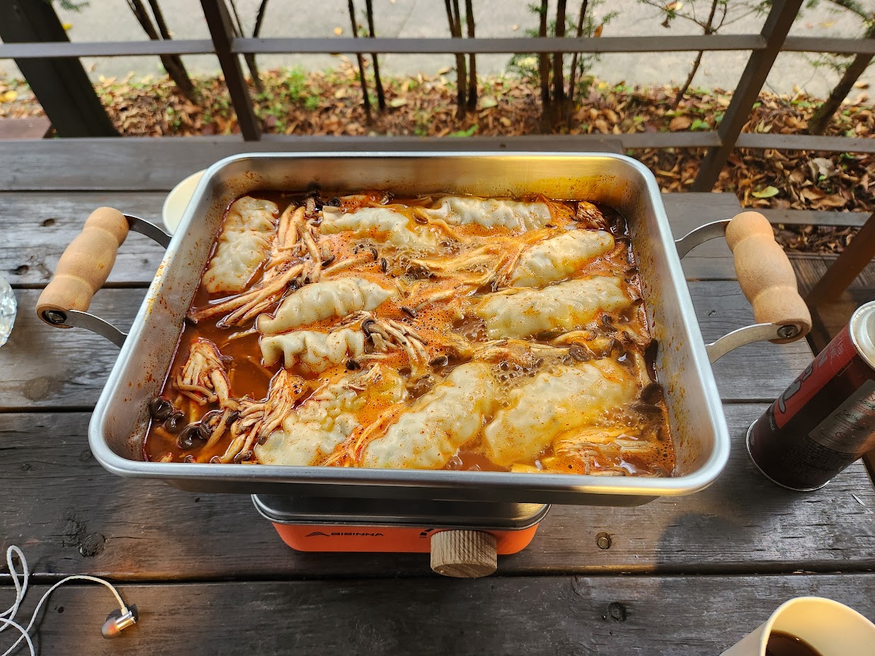 사실 이 밀키트 설명에는 '고기와 버섯이 많이 들었다'고 나와 있었으나 실상은 '그런 거 없다'였습니다. 사실 그럴거라 예상을 하여 이것을 마개조한 것이 이렇습니다. 버섯 한 팩을 따로 사서 넣고, 여기에 만두를 넣어 쇠고기 버섯 만두 전골로 탈바꿈시켰습니다. 여기에 밥 하나를 데워서 쓱쓱 비벼 먹으니 몸에서 힘이 납니다. 대신 만두 선택이 조금 미묘했는데, 매운 전골에 넣을거라 미나리 만두를 골라 봤는데, 미나리 향이 나쁜건 아닌데 너무 진해서 튀었습니다. 그래도 역시 탈탈 털어 먹는 데 아무런 문제가 없었습니다.