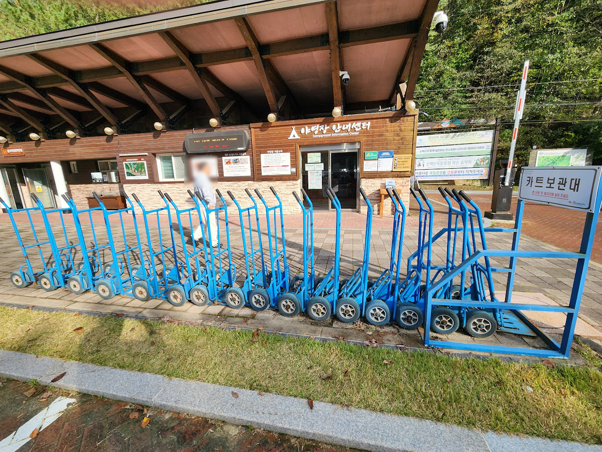 물론 캠핑은 고통을 사서 겪는 마조히즘 취미는 아니기에 영지와 주차장 사이의 짐을 옮기기 편하게 해주는 카트는 제공합니다. 좀 짐이 많다면 사람이 두 명이라면 두 대에 한 번에 싣고 쭉쭉 올라가면 됩니다. 영지 깊숙한 부분만 살짝 언덕이지 나머지는 평지에 준하는 수준이라 크게 힘들지는 않습니다.
