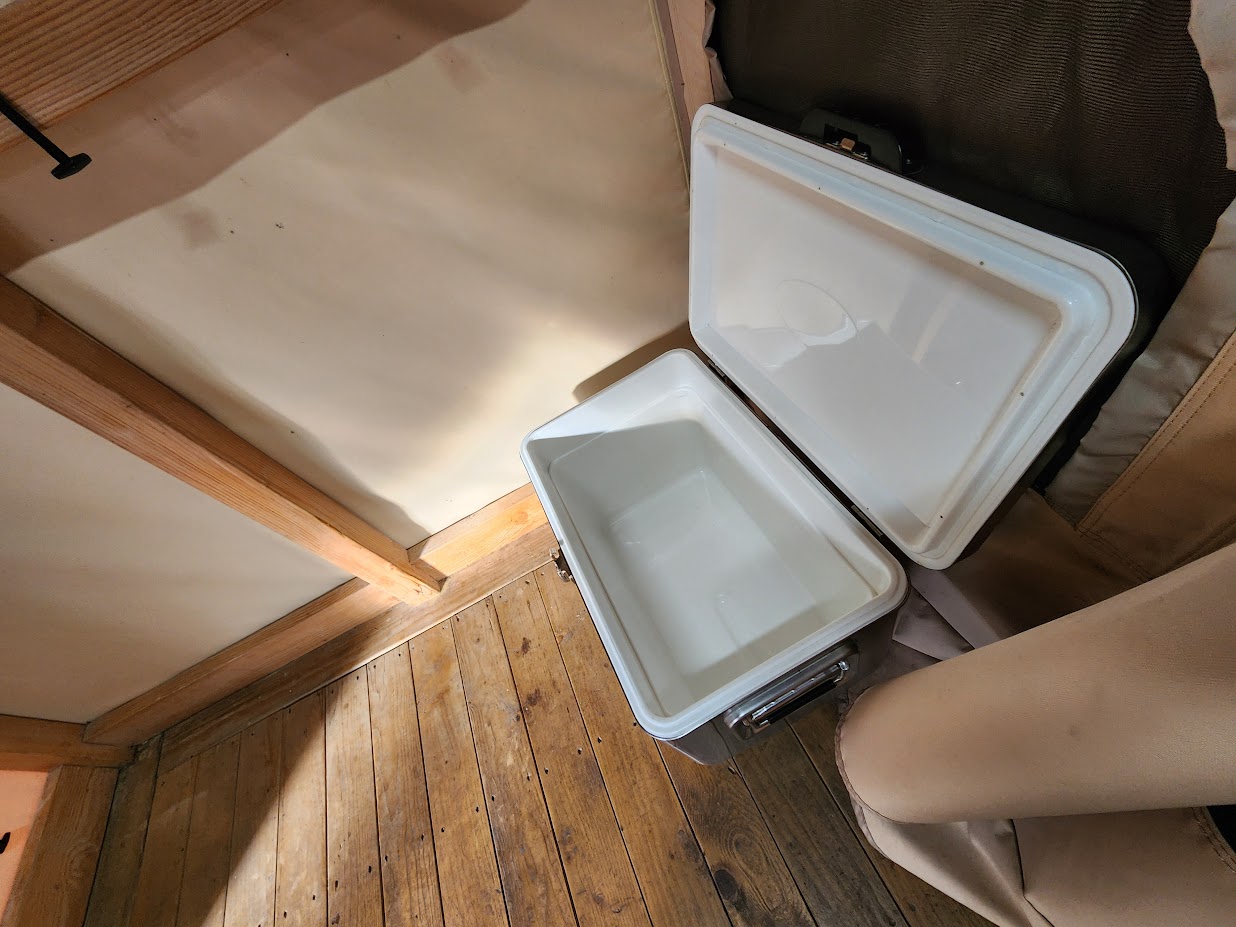 그러면 비가 오면 그냥 손가락 빨고 있어야 하느냐... 사실 이것도 방법은 있습니다. 하우스에는 없고 산막텐트에는 있는 것이 바로 조그마한 전실 공간입니다. 테이블과 의자를 따로 가지고 오신다면 날씨가 궃거나 반대로 추워서 바깥에서 뭘 하기 찝찝하다 할 때는 이 공간에 테이블과 의자를 펴고 조리를 하면 됩니다. 전실에 별도로 조명도 있고 전기도 공급되니 장비만 적절히 준비하면 궃은 날에도 큰 걱정은 없습니다. 산막텐트에서는 아이스박스가 이 전실 공간에 있습니다. 보통 때는 집 수납 공간으로 요긴하게 쓰이죠.