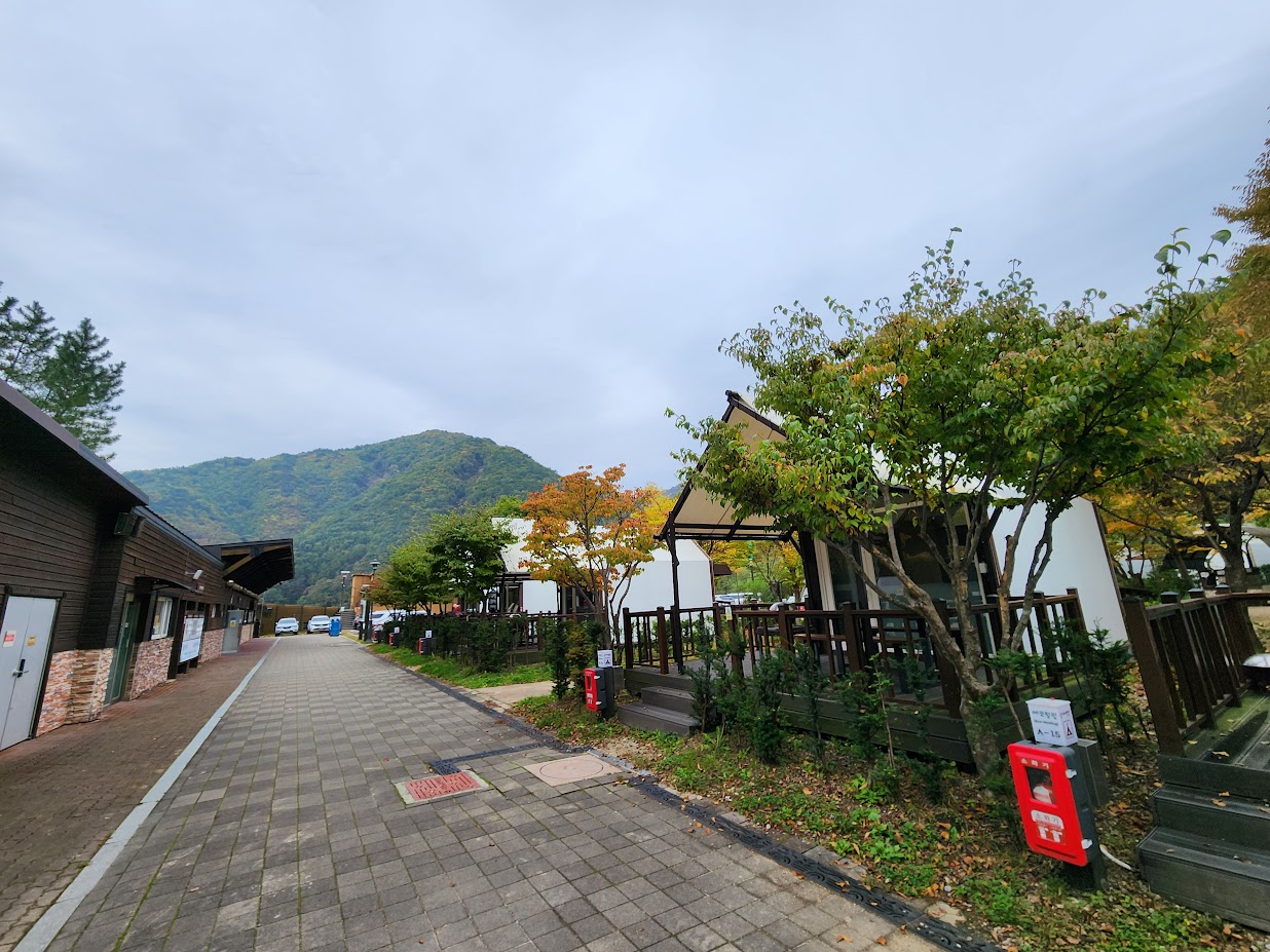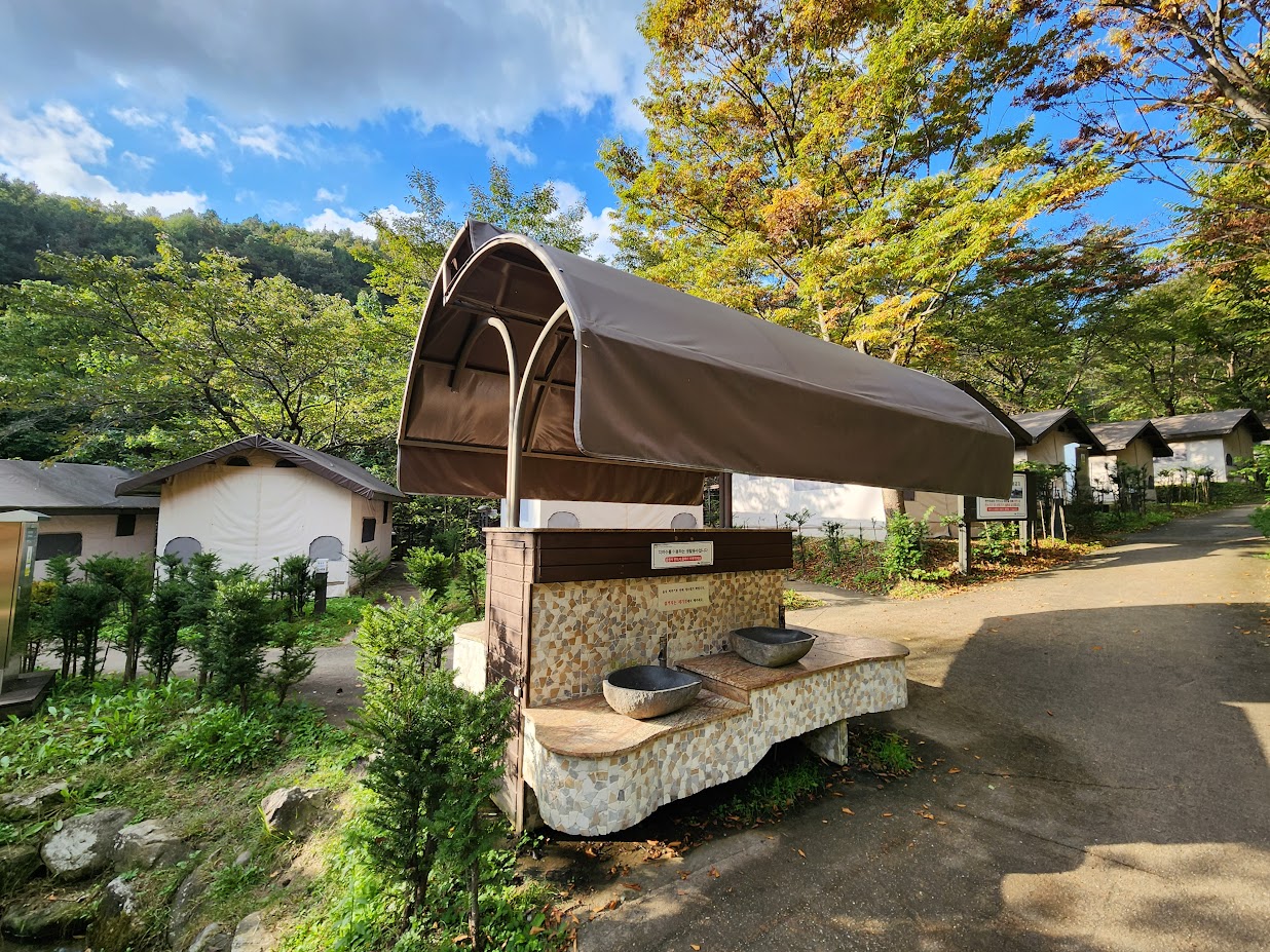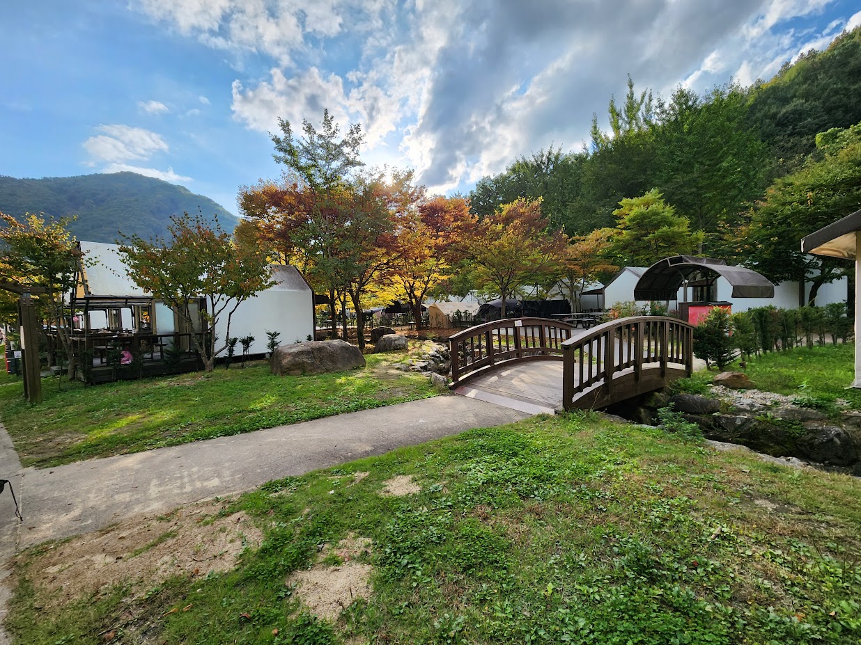 아, 이 캠핑장은 소백산에서 내려온 계곡이 옆에 있지만 깊어서 내려가기는 어렵고 대신 물소리를 꽤 들을 수 있습니다. 어린이용으로 인공 냇가를 캠핑장 가운데에 만들어 놓아서 봄에는 이 주변으로 아이들이 신나게 놀았는데, 지금은 가을이라서 그 정도는 아니었습니다.
