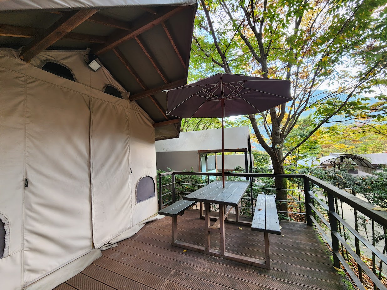 여기에 바깥 활동을 하는 부분에서 차이가 있는데, 하우스는 이 부분이 고정된 캐노피로 제공됩니다. 캐노피 + 파라솔 겸용인 곳도 있기는 하지만 일단 캐노피는 다들 있습니다. 뒤에서 다시 이야기를 하겠으나 산막텐트는 그냥 파라솔이라 비가 제대로 내린다면 바깥 활동은 사실상 무리가 됩니다. 폭우가 내리면 캐노피가 있어도 비가 들칠 가능성은 있지만 웬만한 비나 눈을 막아주어 바깥 활동이 가능하다는 것이 하우스 최대의 장점입니다. 바깥 공간에는 나무 테이블과 화로대가 비치되어 있습니다.